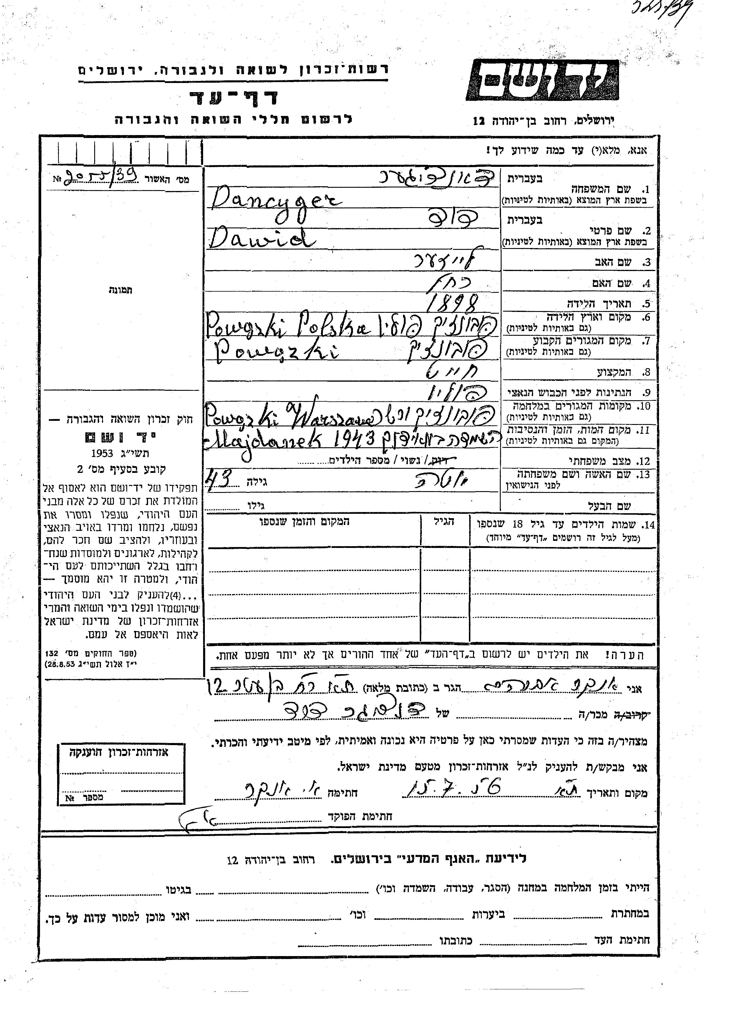 Dawid Dancyger was born in Poworsk, Poland, 1898 to Leizer and Rakhel. He was a tailor and married to Yuta. Prior to WWII he lived in Poworsk, Poland. During the war he was in Warszawa, Poland. Dawid was murdered in the Shoah. Place of death: Majdanek, Poland, 1943.
