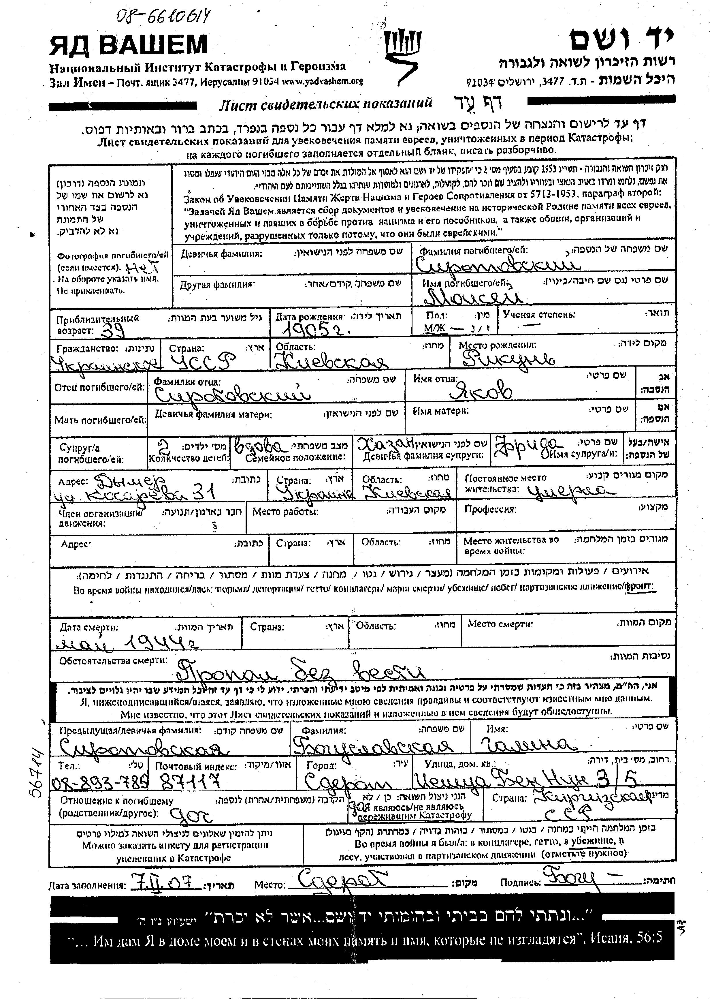 Moisei Sirotovski was born in Rykun, Ukraine (USSR), 1905 to Yakov. He was married to Frida nee Khazan. Prior to WWII he lived in Dymer, Ukraine (USSR). During the war he was in the Soviet armed forces. Moisei was murdered in the Shoah. Place of death: unknown, 05/1944.