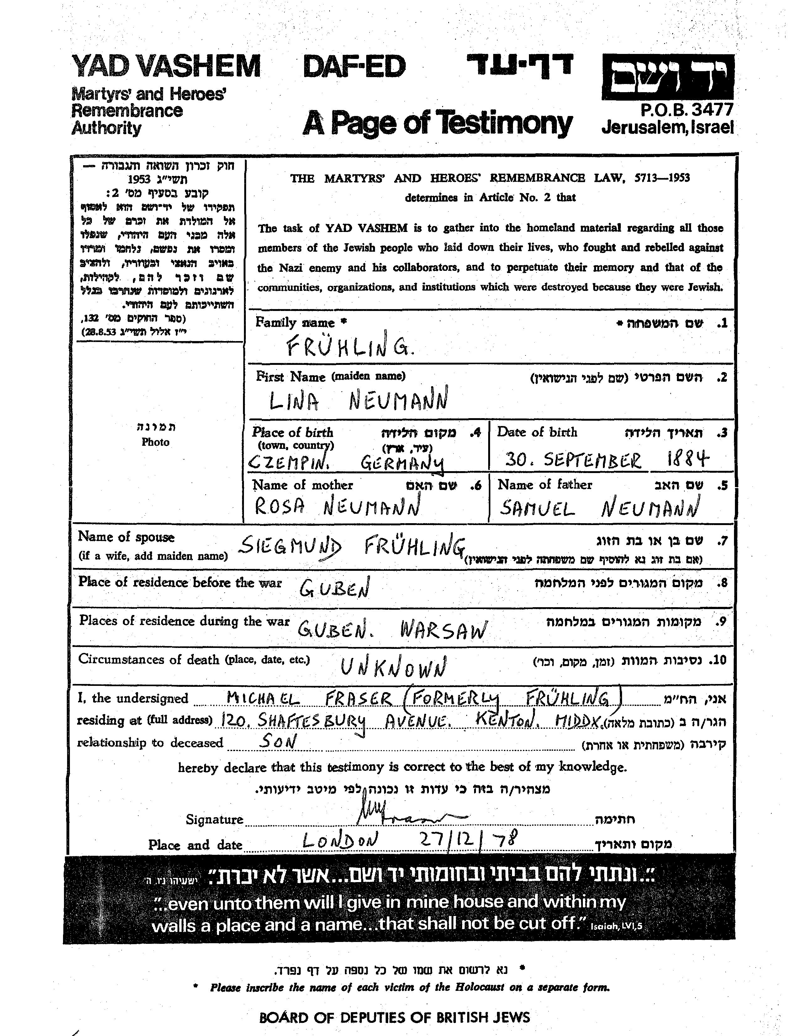 Lina Fruehling nee Neumann was born in Czempin, Poland, 1884 to Samuel and Rosa. She was married to Siegmund. Prior to WWII she lived in Guben, Germany. During the war she was in Warsaw, Poland. Lina was murdered in the Shoah.