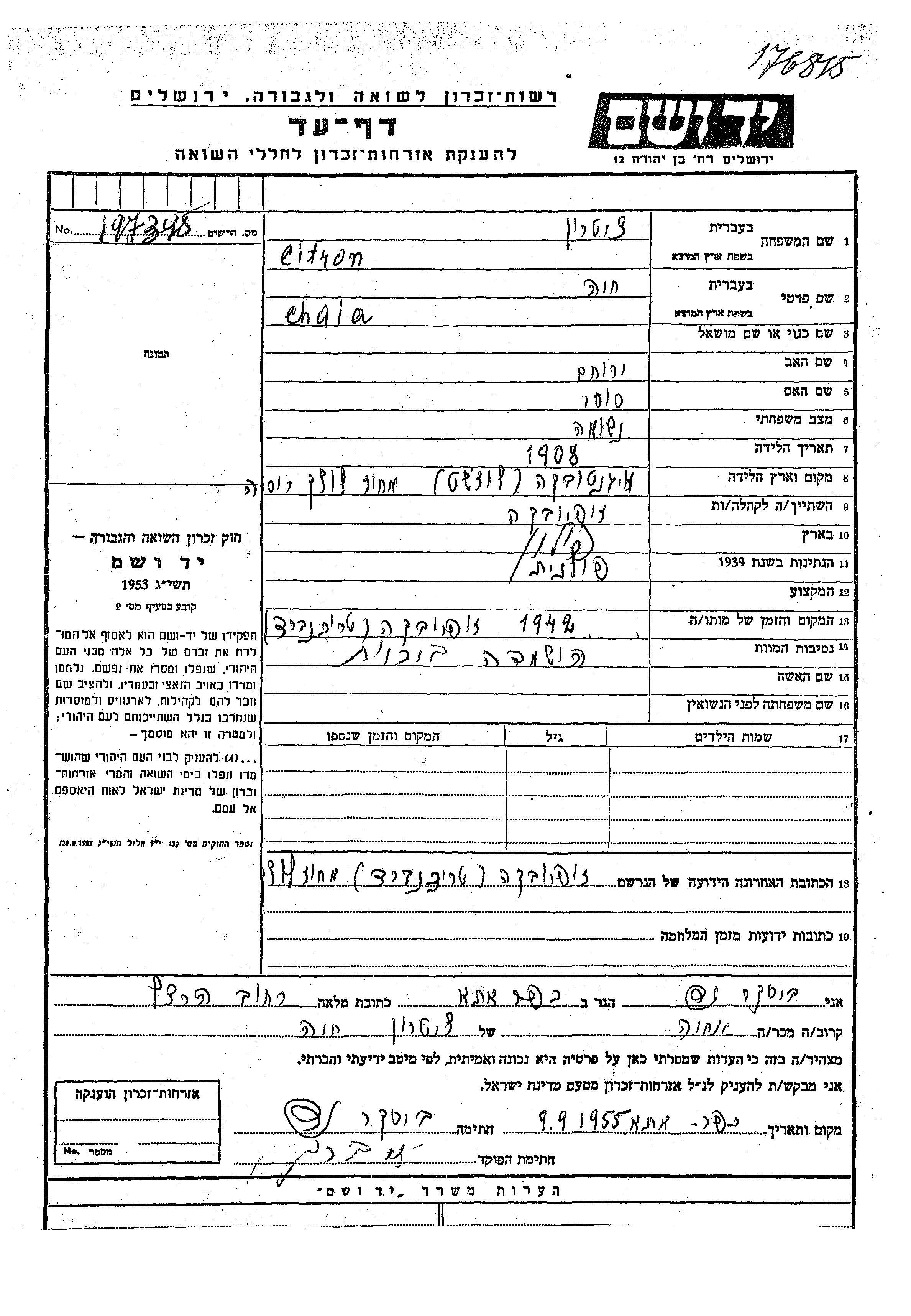 Chaia Citron was born in Ignatowka, Poland, 1908 to Yerukham and Sosi. She was married. Prior to WWII she lived in Zofjówka, Poland. During the war she was in Poland. Chaia was murdered in the Shoah. Place of death: Zofjówka, Poland, 1942.