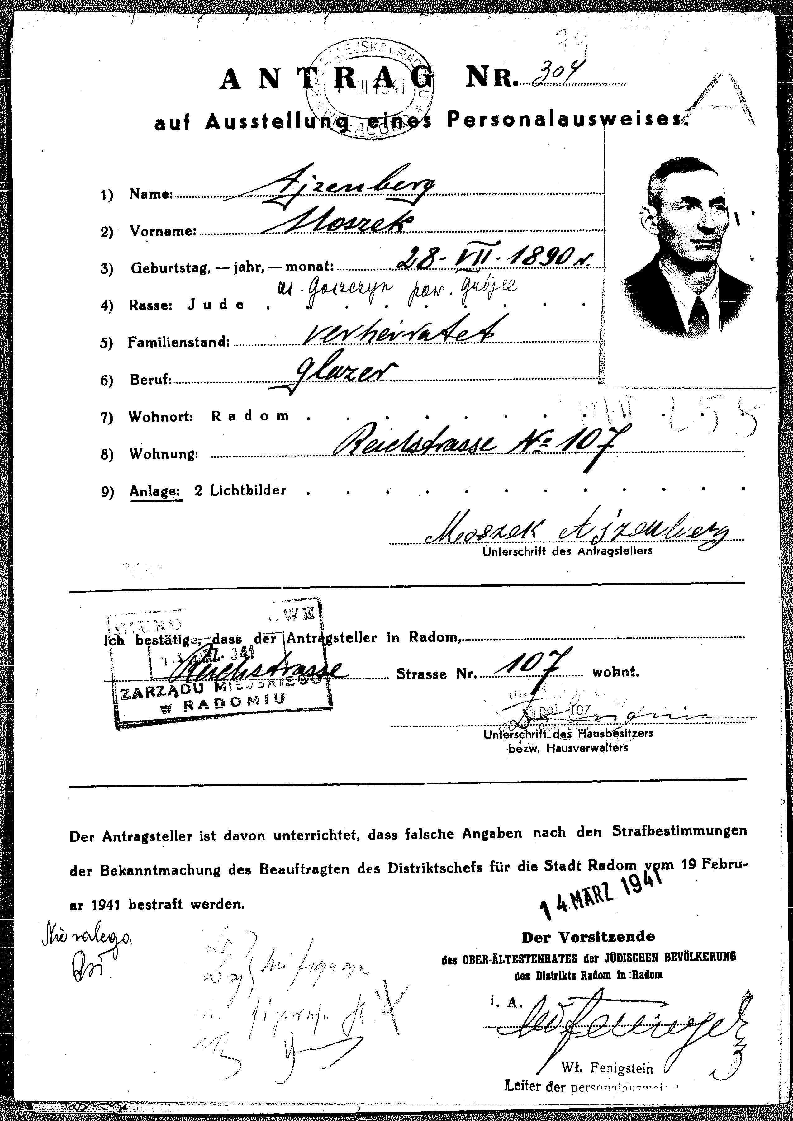 Moszek Ajzenberg was born in Goszczyn, Poland, 1890. He was a glazer and single. Prior to WWII he lived in Radom, Poland. During the war he was in Radom, Poland. Moszek Probably murdered the Shoah.