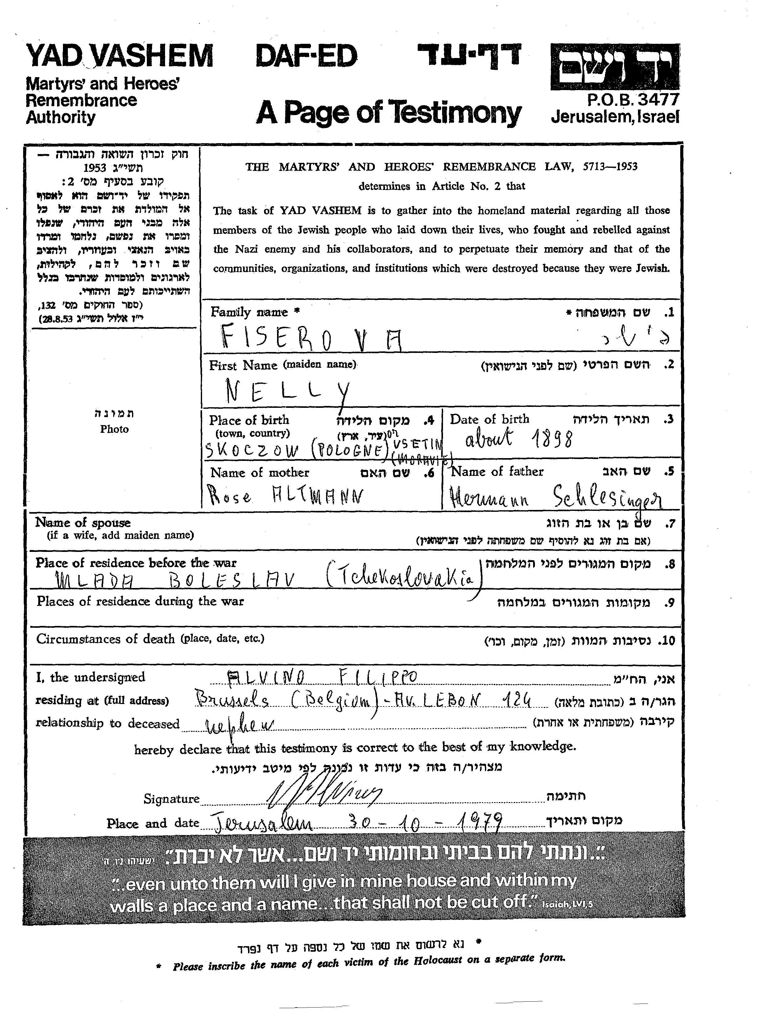 Fiserova Melly 1898 Mlada Boleslav, Czechoslovakia Page of Testimony