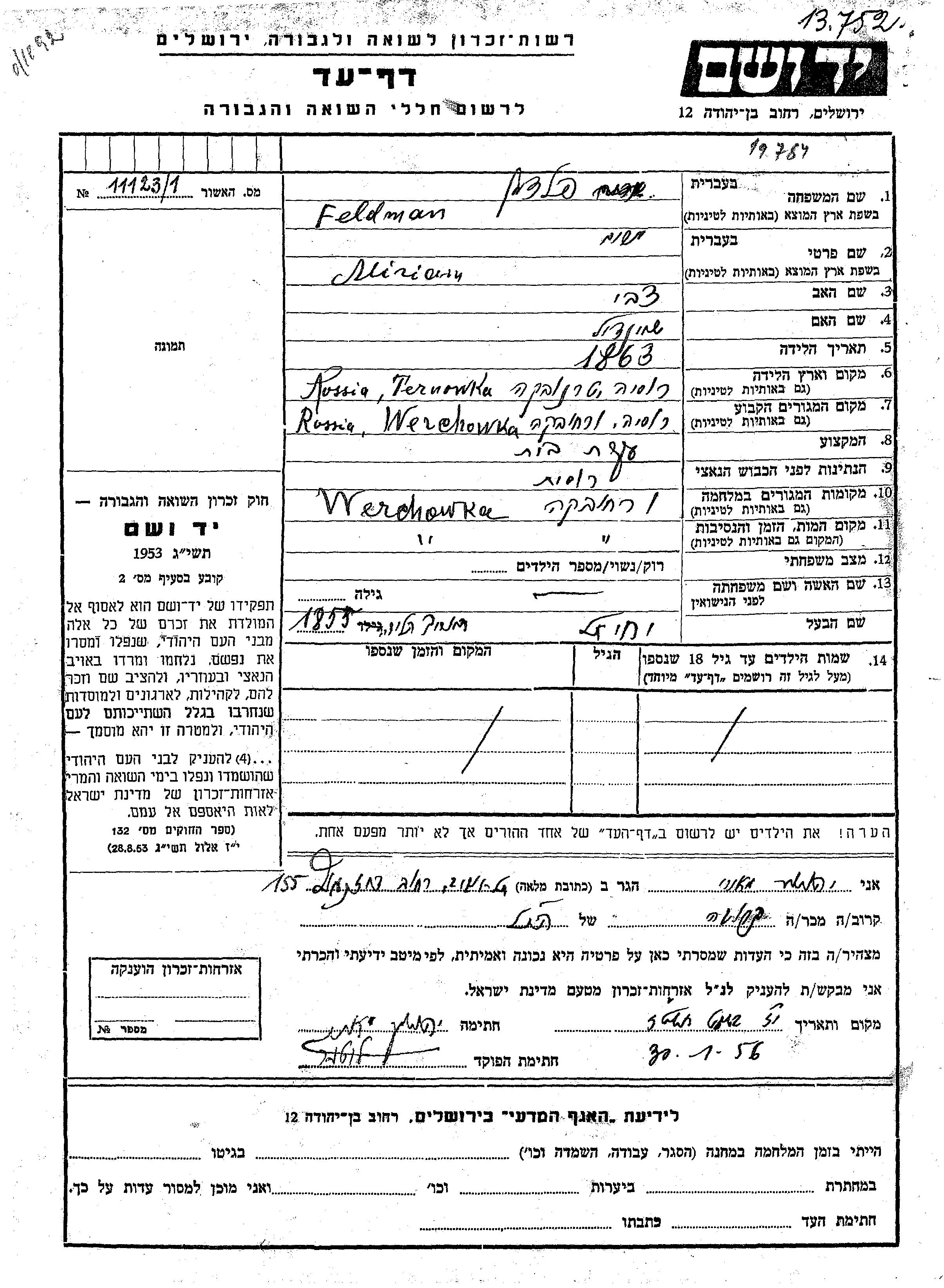 Feldman Miriam 1863 Werchowka, Ukraine (USSR) Page of Testimony