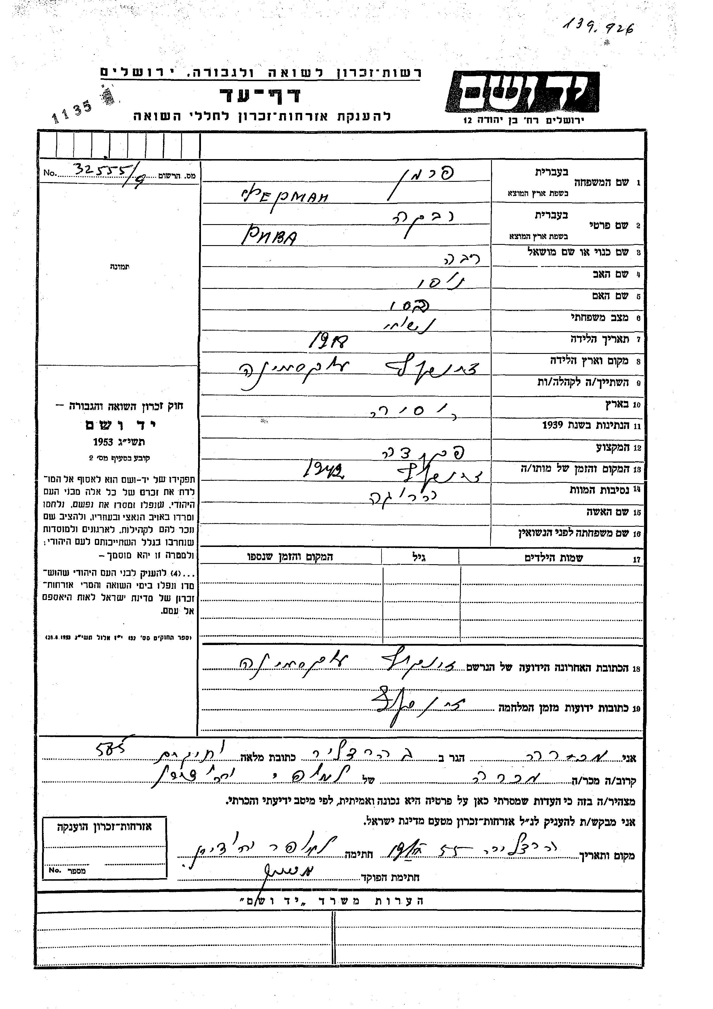 Riva Ferman was born in Zinkiv, Ukraine (USSR), 1918 to Nusi and Besi. She was a clerk and married. Prior to WWII she lived in Zinkiv, Ukraine (USSR). During the war she was in Zinkiv, Ukraine (USSR). Riva was murdered in the Shoah. Place of death: Zinkiv, Ukraine (USSR), 1942.