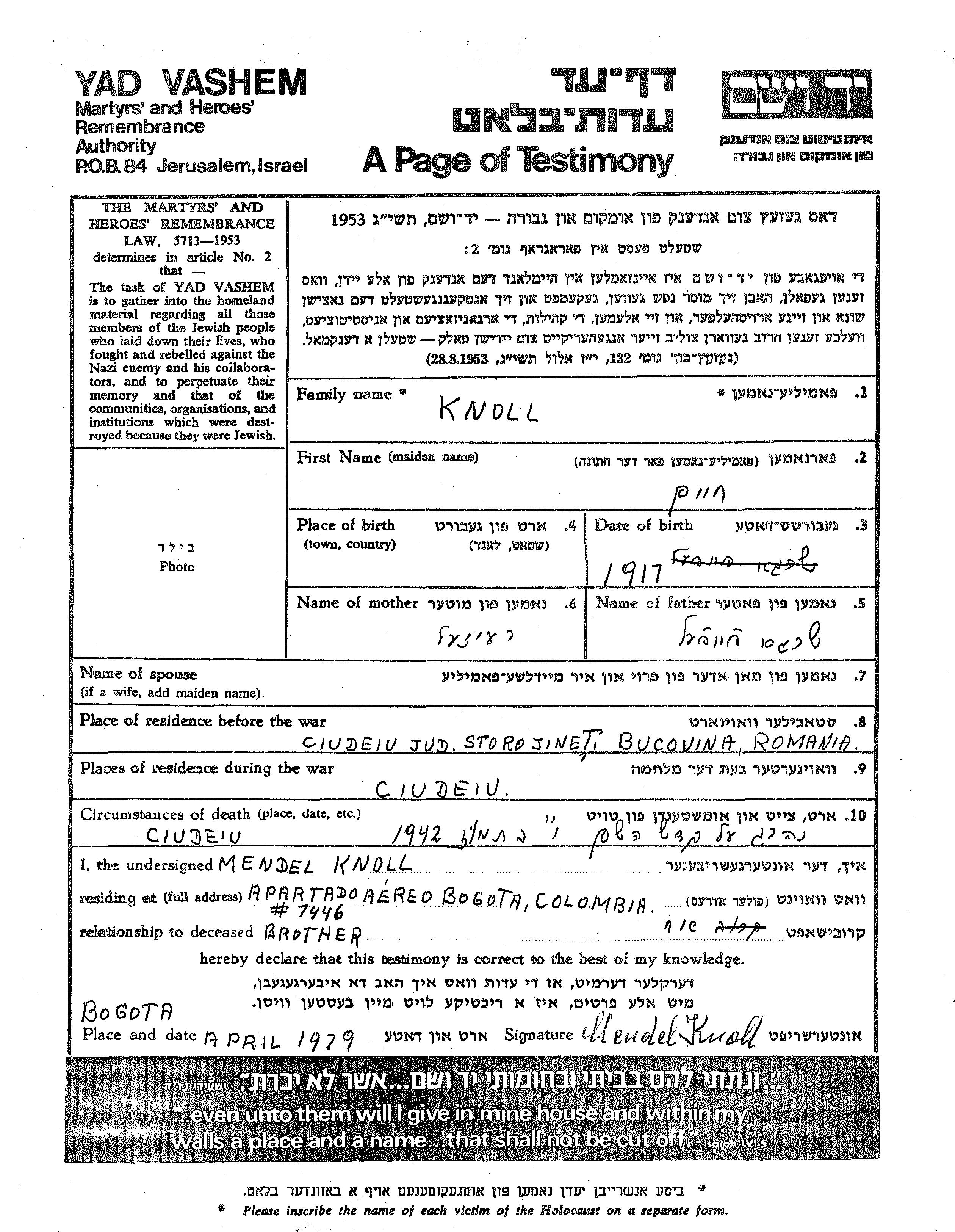 Khaim Knoll was born, 1917 to Shraga Faivel and Reizel. Prior to WWII he lived in Ciudeiu, Romania. During the war he was in Ciudeiu, Romania. Khaim was murdered in the Shoah. Place of death: Ciudeiu, Romania, 1942.