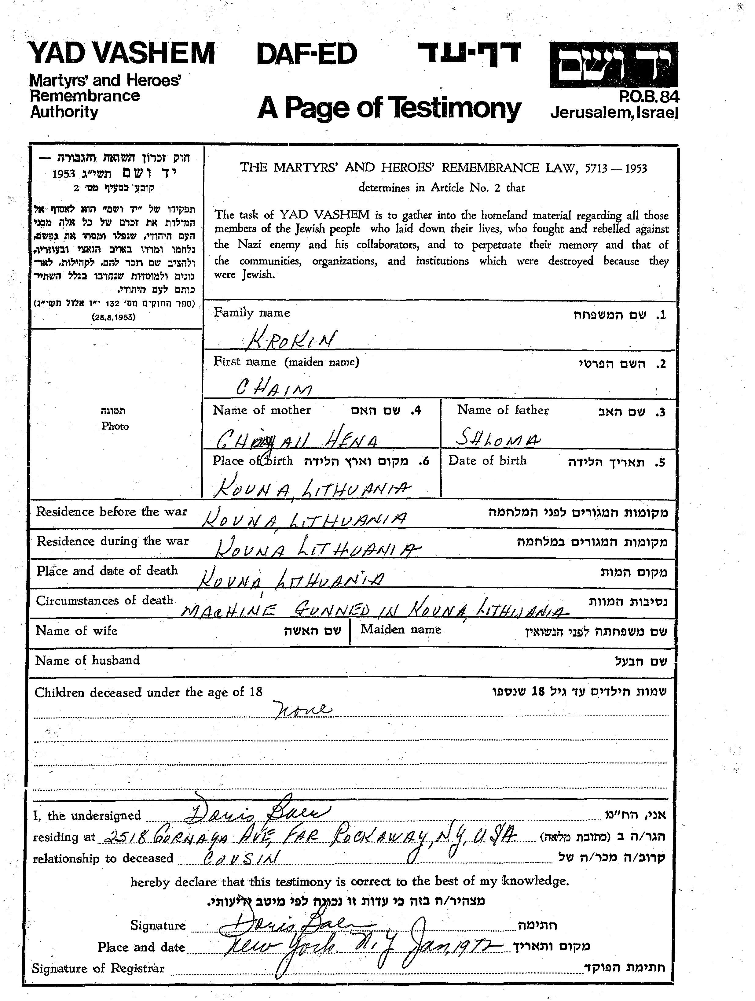 Krokin Chaim Kowna, Lithuania Page of Testimony
