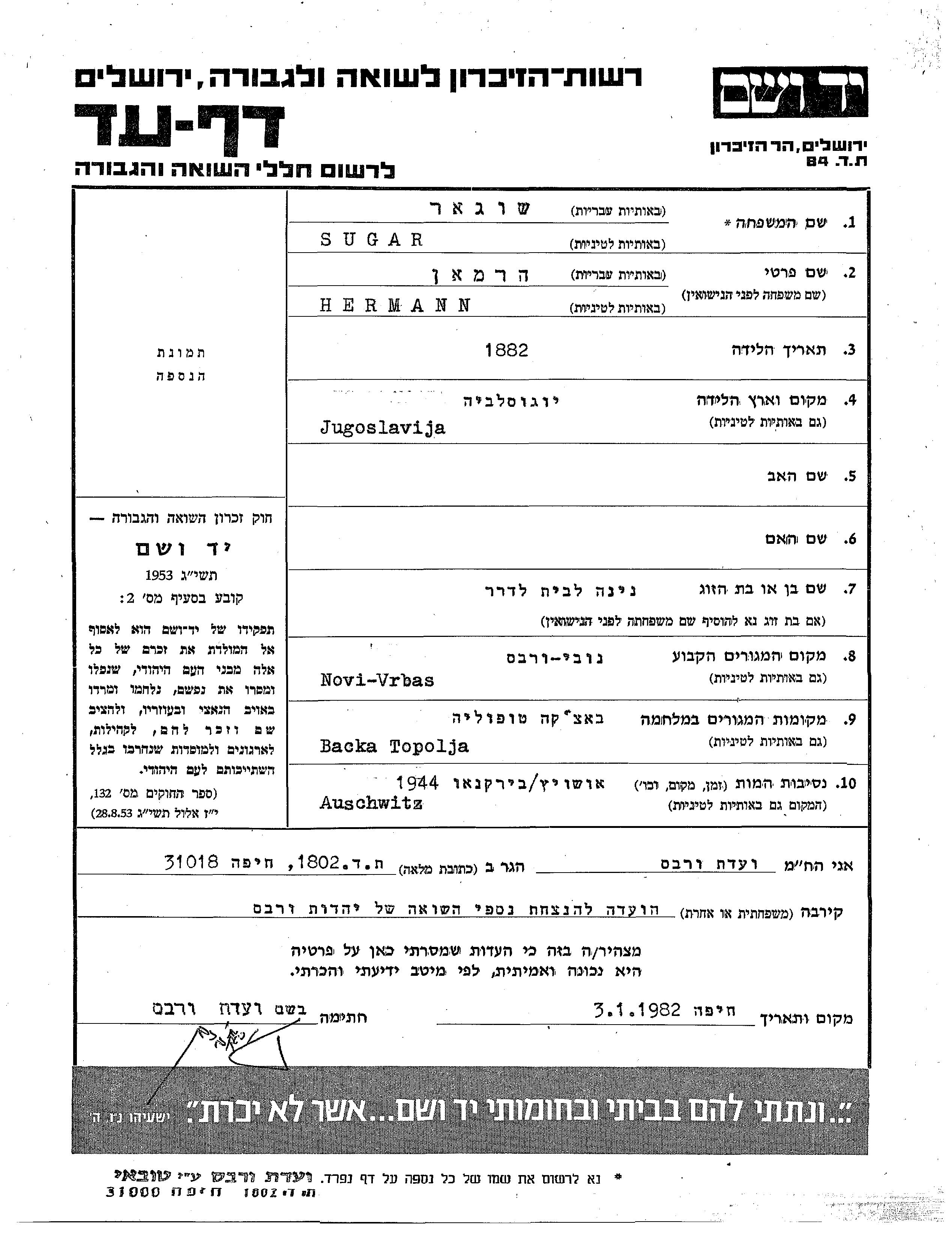 Shugar Hermann 1882 Novi Vrbas, Yugoslavia Page of Testimony