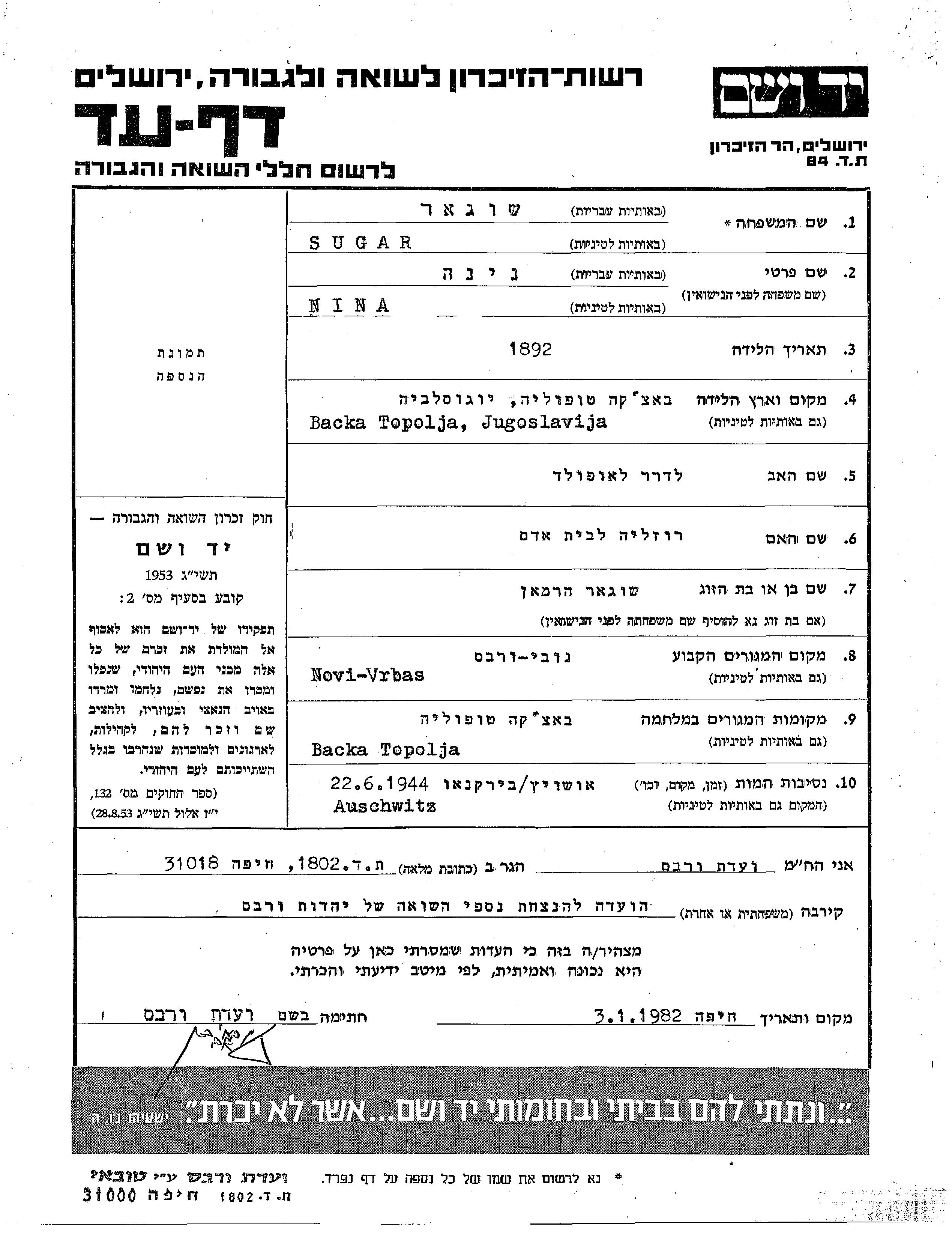 Shugar Nina 1892 Novi Vrbas, Yugoslavia Page of Testimony