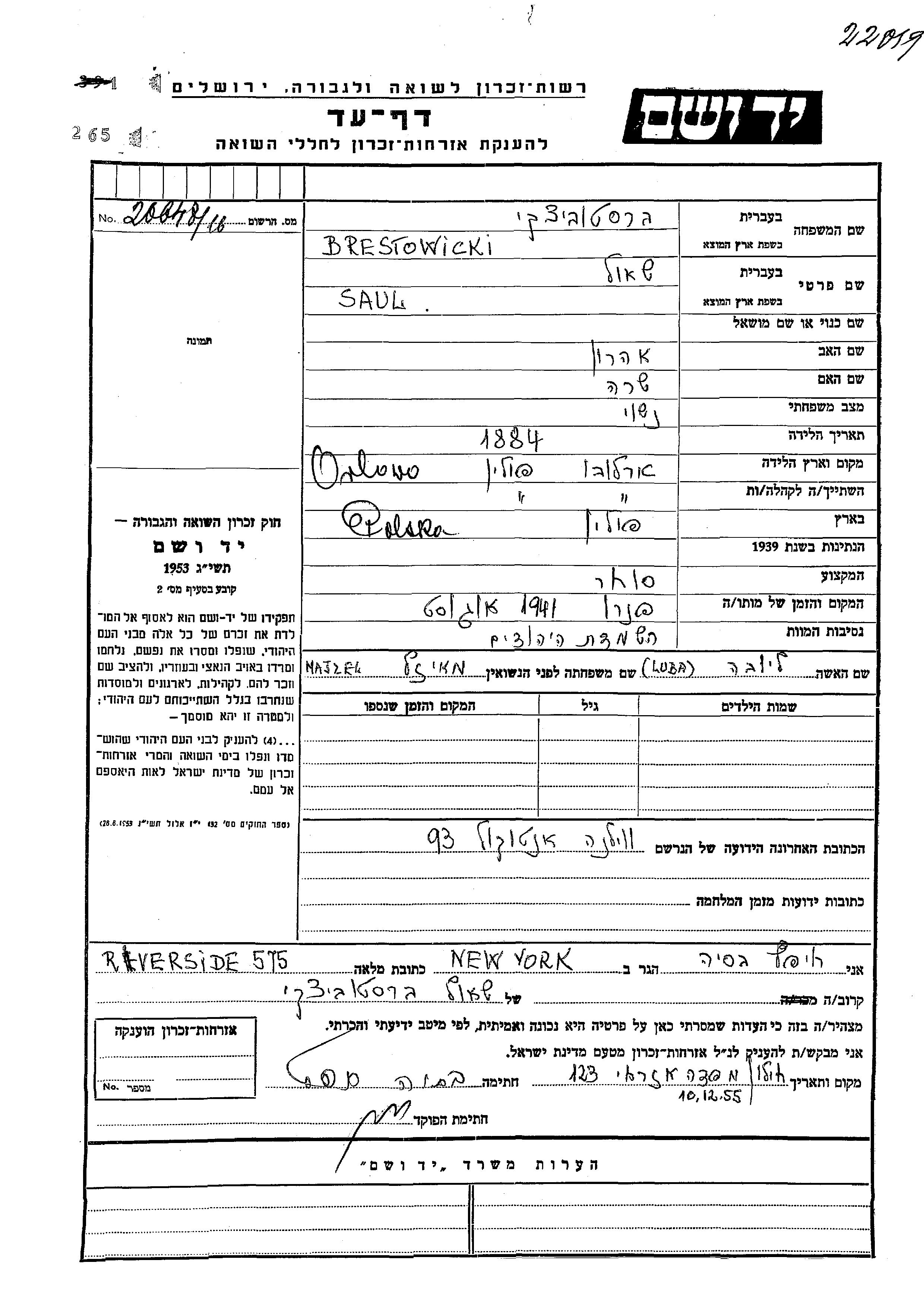 Shaul Brestowicki was born in Orlowo, Poland, 1884 to Aharon and Sara. He was a merchant. During the war he was in Wilno, Poland.