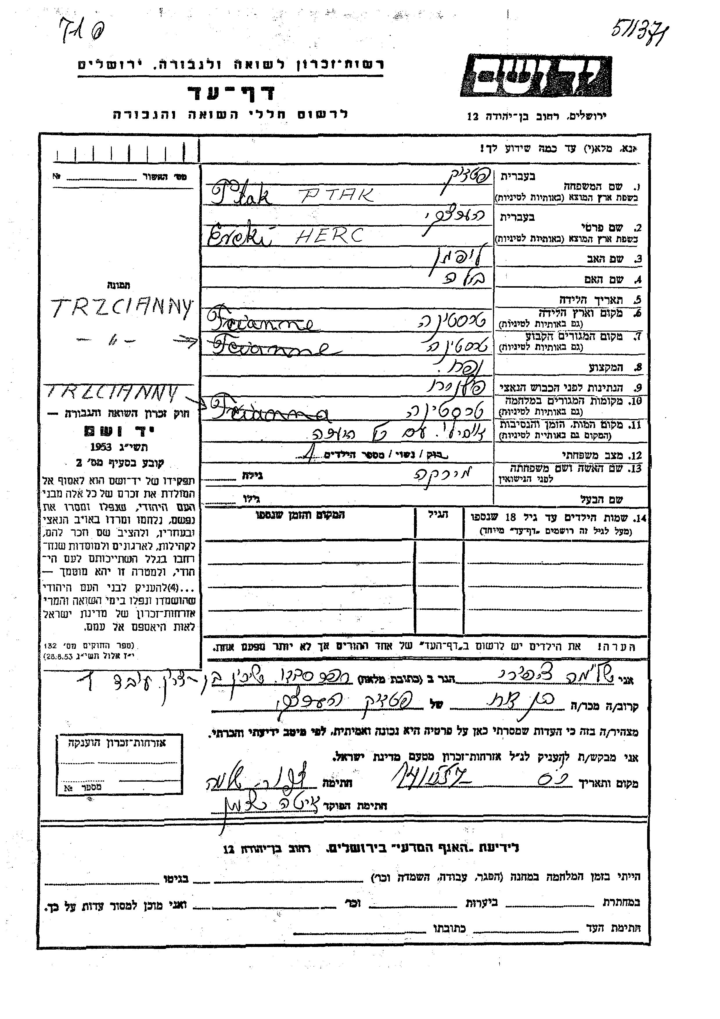 Ercki Herc Ptak Patak was born in Trzciana, Poland to Lipman and Bila. He was a blacksmith and married to Mirka. Prior to WWII he lived in Trzciana, Poland. During the war he was in Trzciana, Poland. Ercki Herc was murdered in the Shoah.
