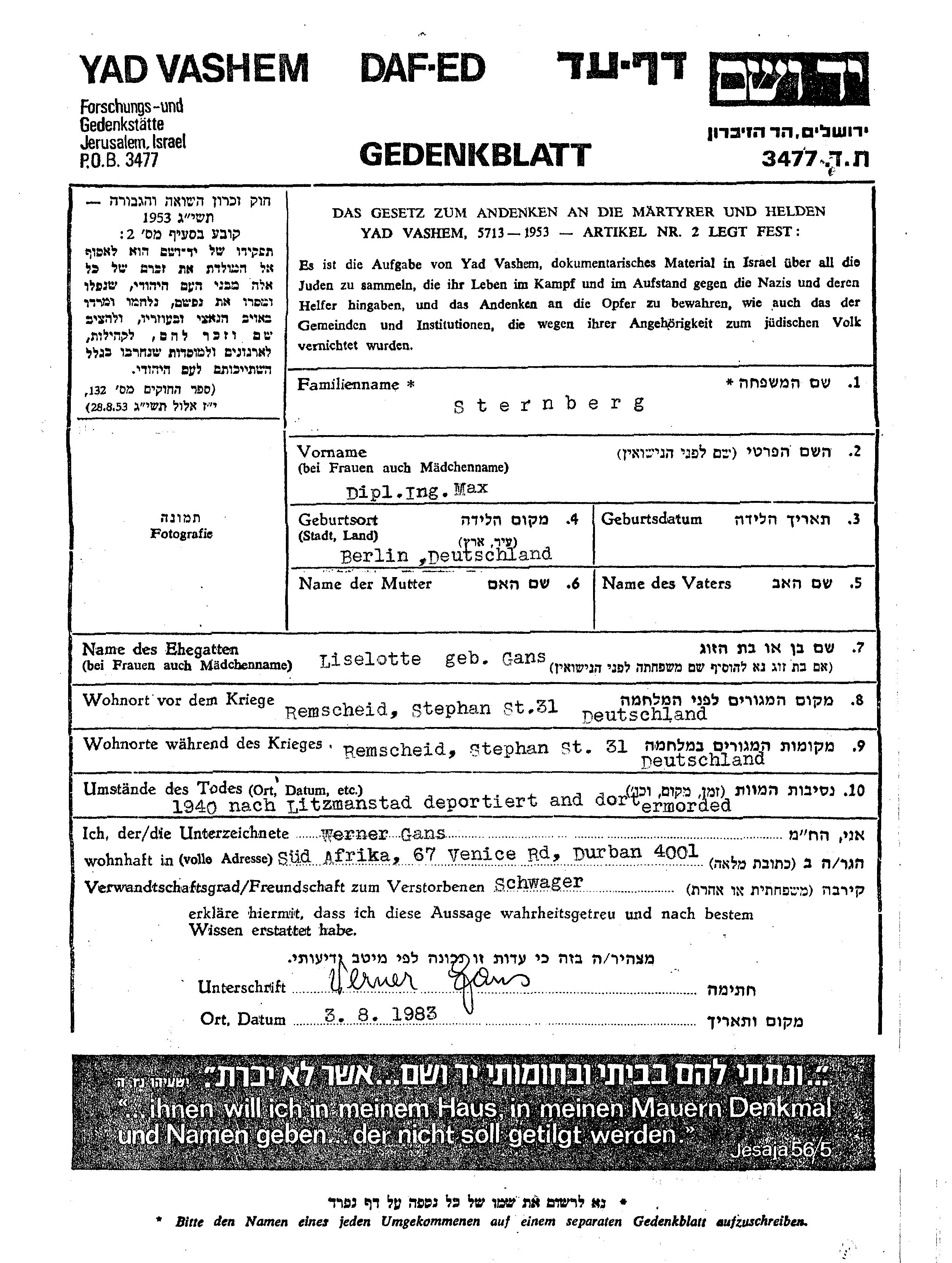 Sternberg Max Remscheid, Germany Page of Testimony