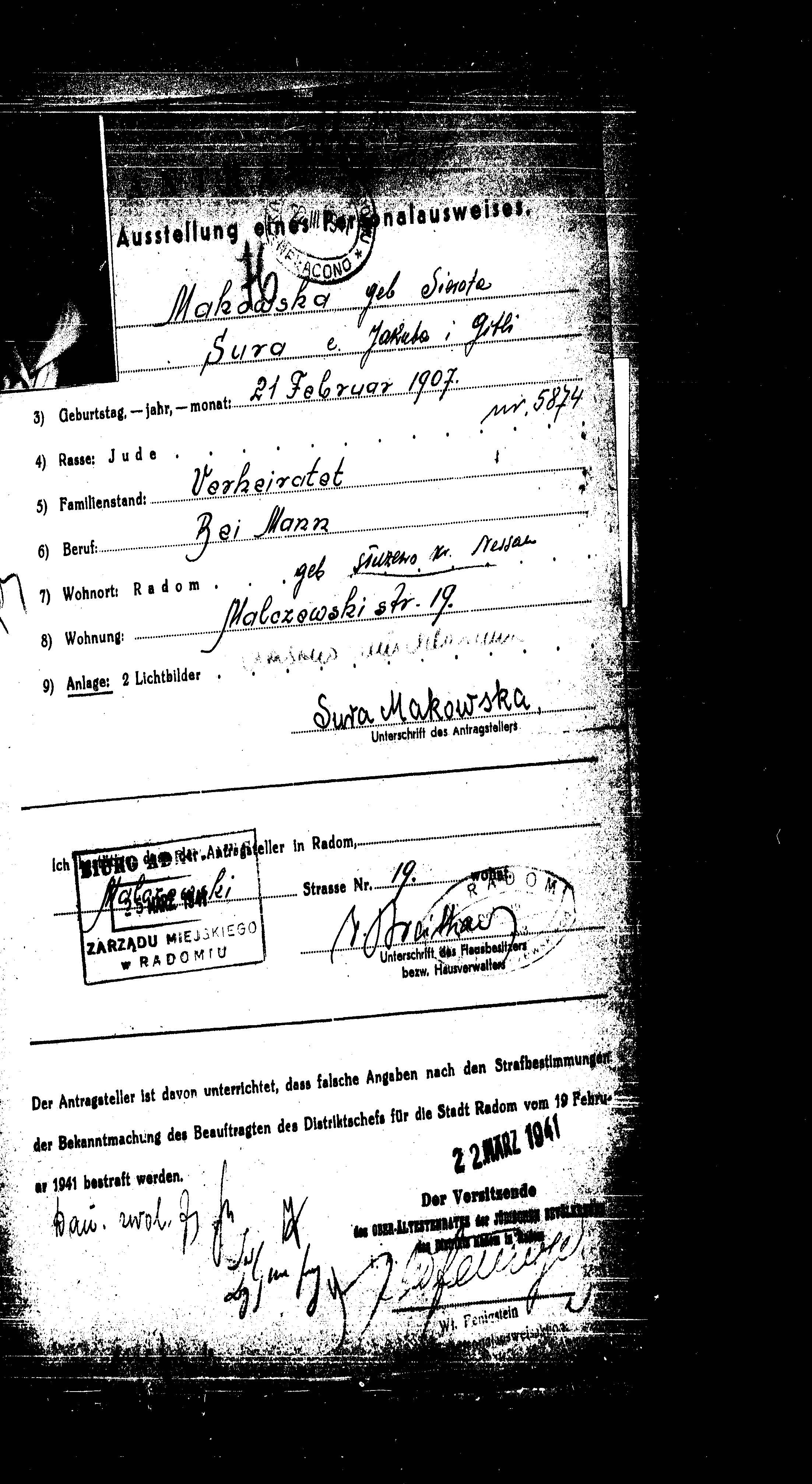 Sura Makowska nee Sierota was born in Sluzewo, Poland, 1907 to Jakub and Gitla. She was a housewife and married. Prior to WWII she lived in Radom, Poland. During the war she was in Radom, Poland. Sura Probably murdered the Shoah.