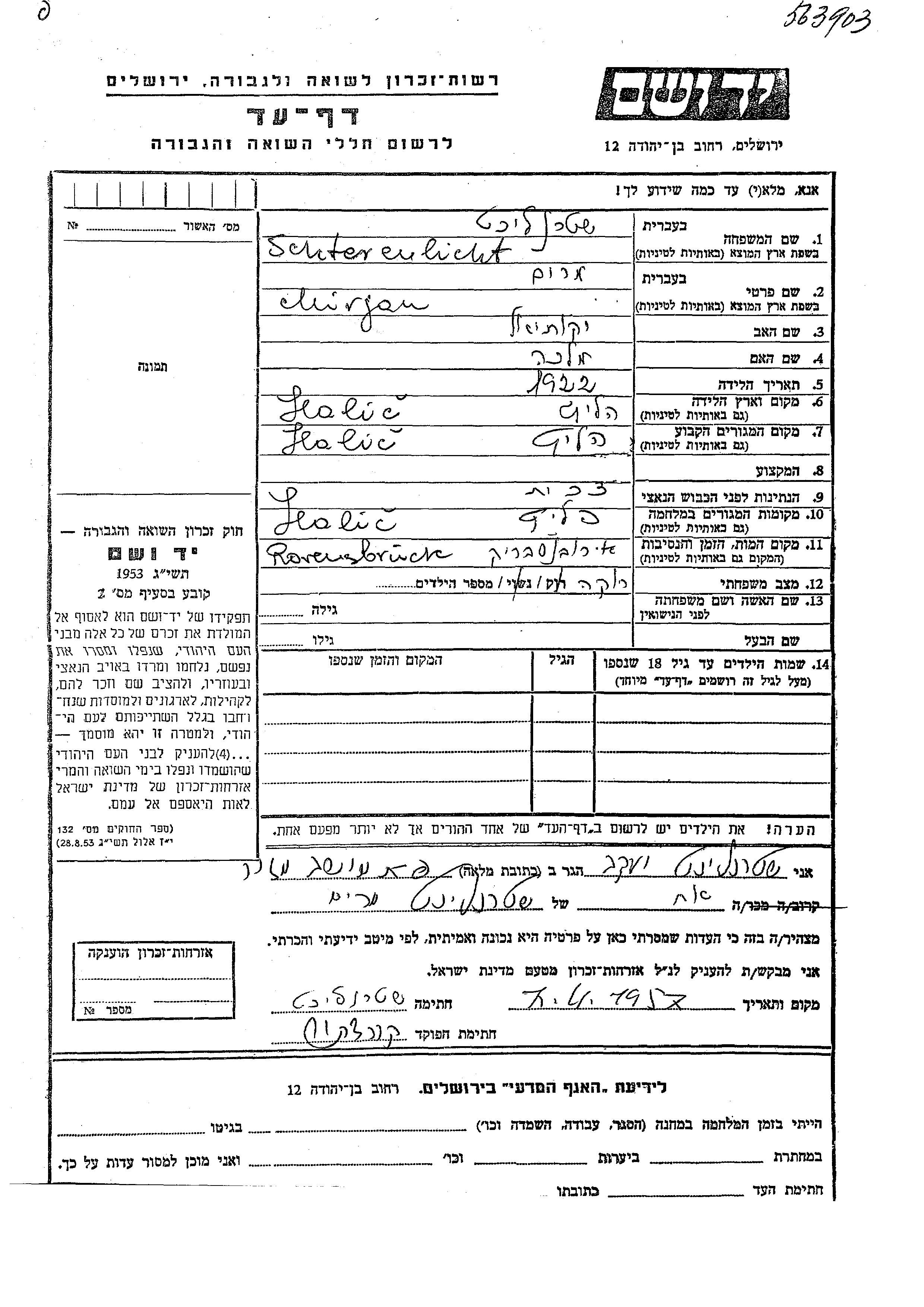 Mirjam Schterenlicht was born in Halic, Czechoslovakia, 1922 to Yekutiel and Malka. She was single. Prior to WWII she lived in Halic, Czechoslovakia. During the war she was in Halic, Czechoslovakia. Mirjam was murdered in the Shoah. Place of death: Ravensbrück, Germany.