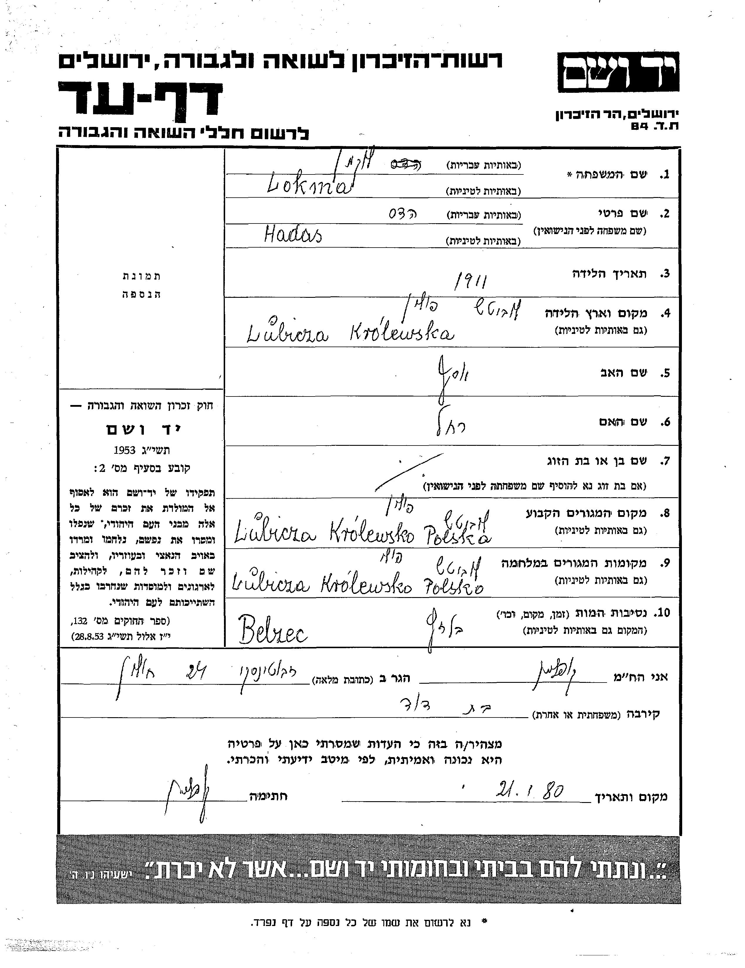 Lokma Hadas 1911 Lubycza Krolewska, Poland Page of Testimony