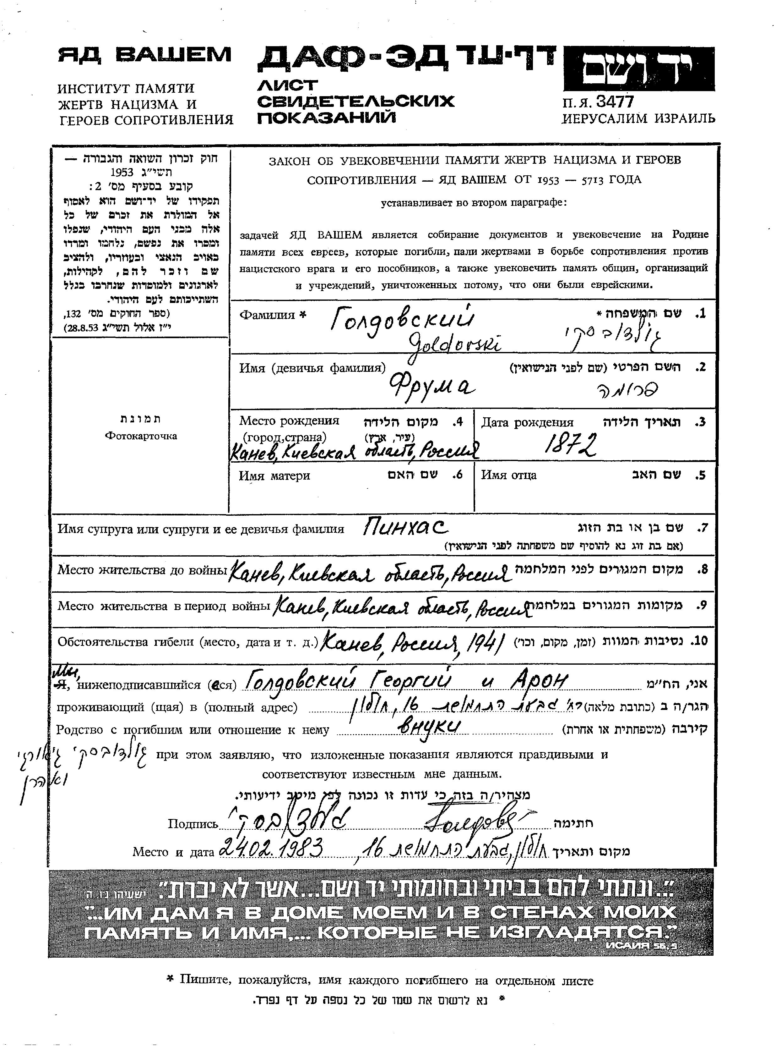 Fruma Goldovski was born in Kanev, Ukraine (USSR), 1872. She was married to Pinkhas. Prior to WWII she lived in Kanev, Ukraine (USSR). During the war she was in Kanev, Ukraine (USSR). Fruma was murdered in the Shoah. Place of death: Kanev, Ukraine (USSR), 1941.