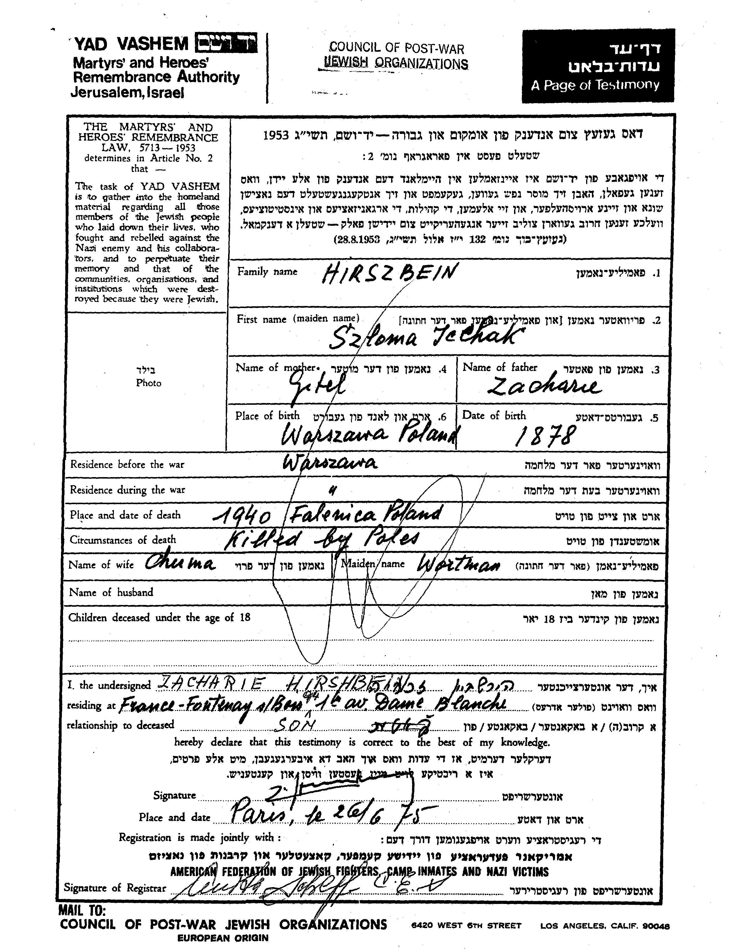 Hirszbein Schlomo Itchak 1878 Varsovia, Poland Page of Testimony