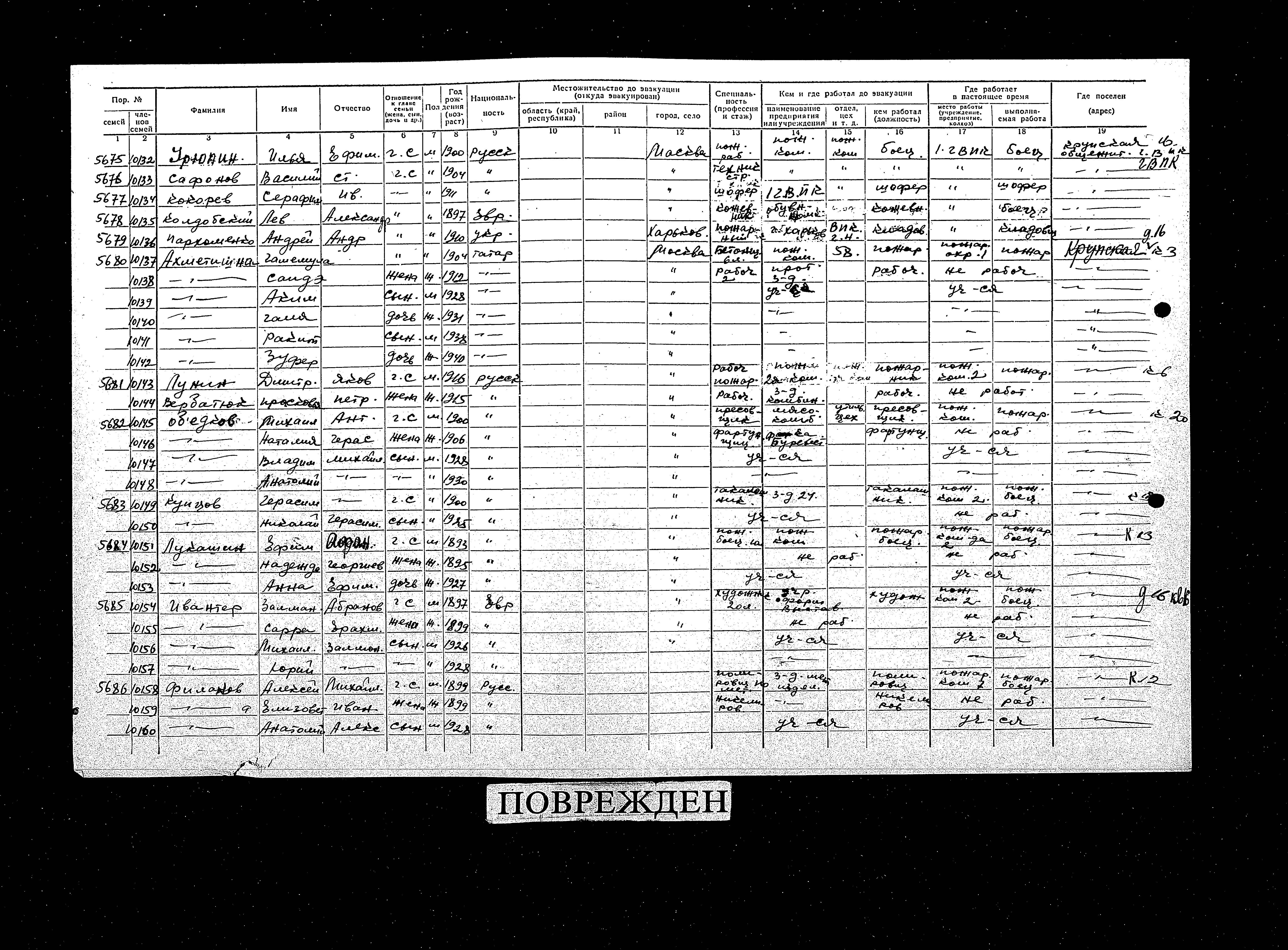 Lev Koldobski was born, 1897 to Aleksandr. He was a tanner. Prior to WWII he lived in Moskva, Russia (USSR). During the war he was in Kuybyshev, Russia (USSR). Lev was registered following the evacuation/ in the interior of the Soviet Union.
