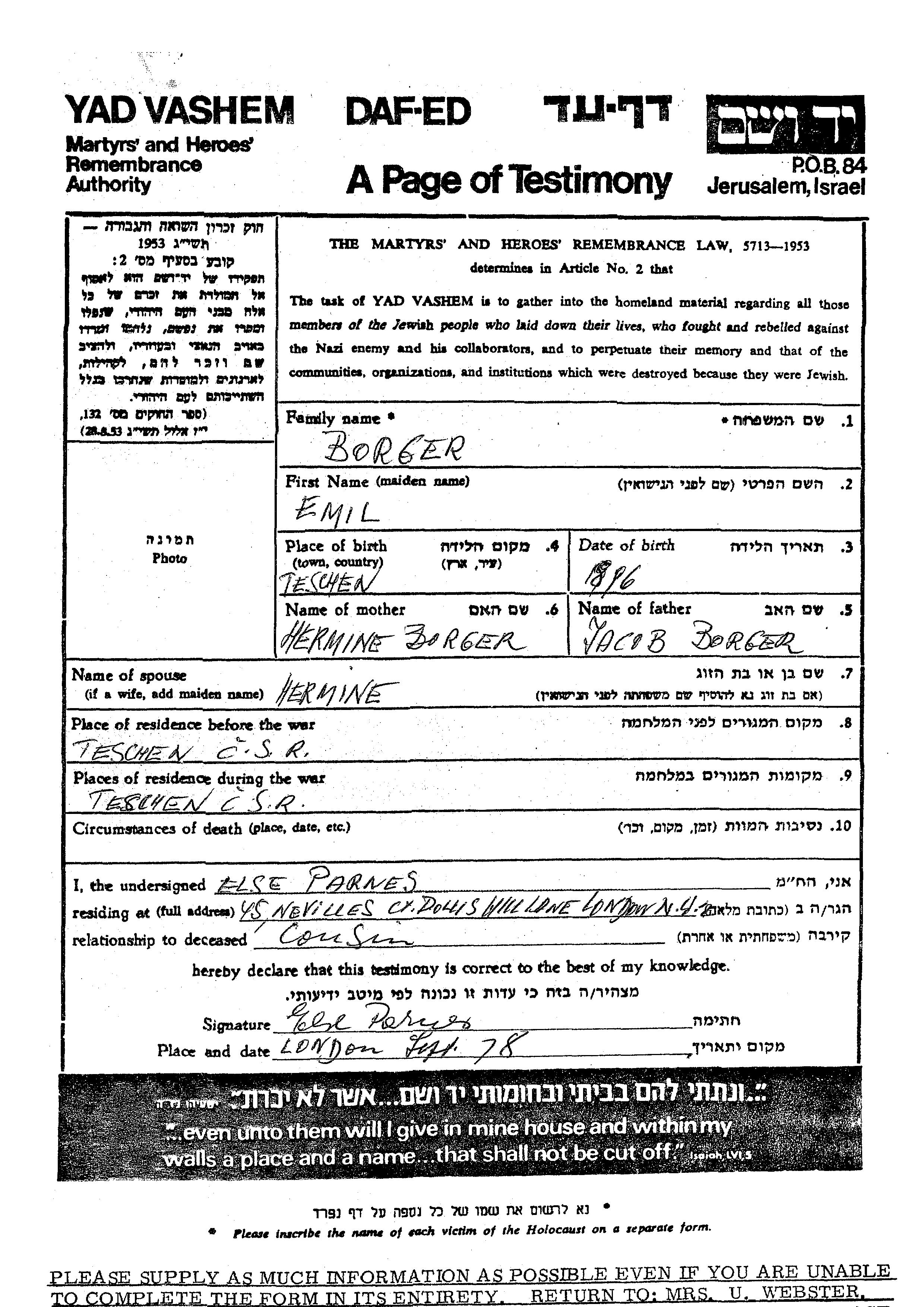 Emil Burger was born in Teschen, 1896 to Yacob and Hermine. Prior to WWII he lived in Teschen, Czechoslovakia. During the war he was in Teschen, Czechoslovakia. Emil was murdered in the Shoah.