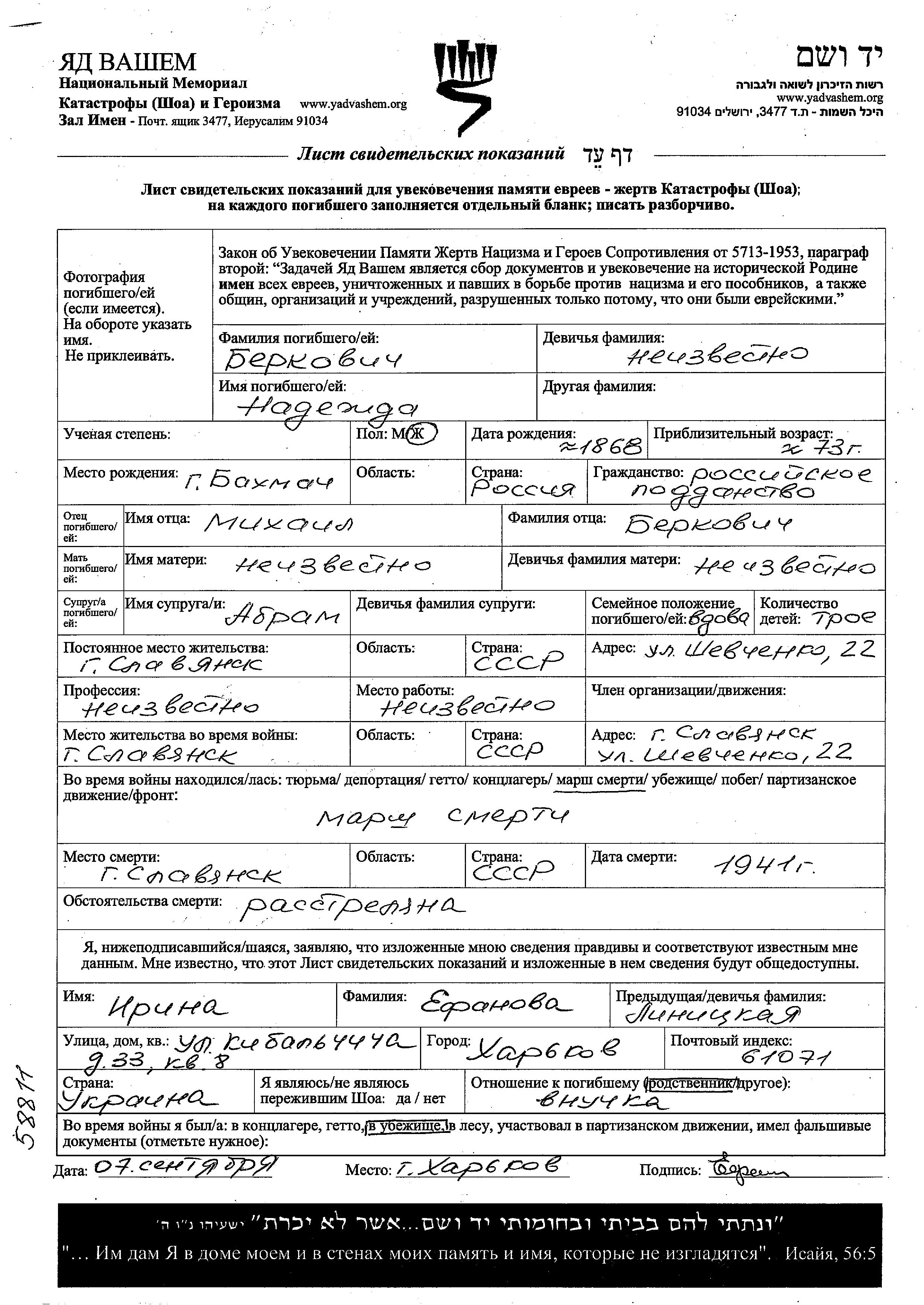 Nadezhda Berkovich was born in Bakhmach, Ukraine (USSR), 1868 to Mikhail. She was a widow of Abram. Prior to WWII she lived in Slavyansk, Ukraine (USSR). During the war she was in Slavyansk, Ukraine (USSR). Nadezhda was murdered in the Shoah. Place of death: Slavyansk, Ukraine (USSR), 1941.