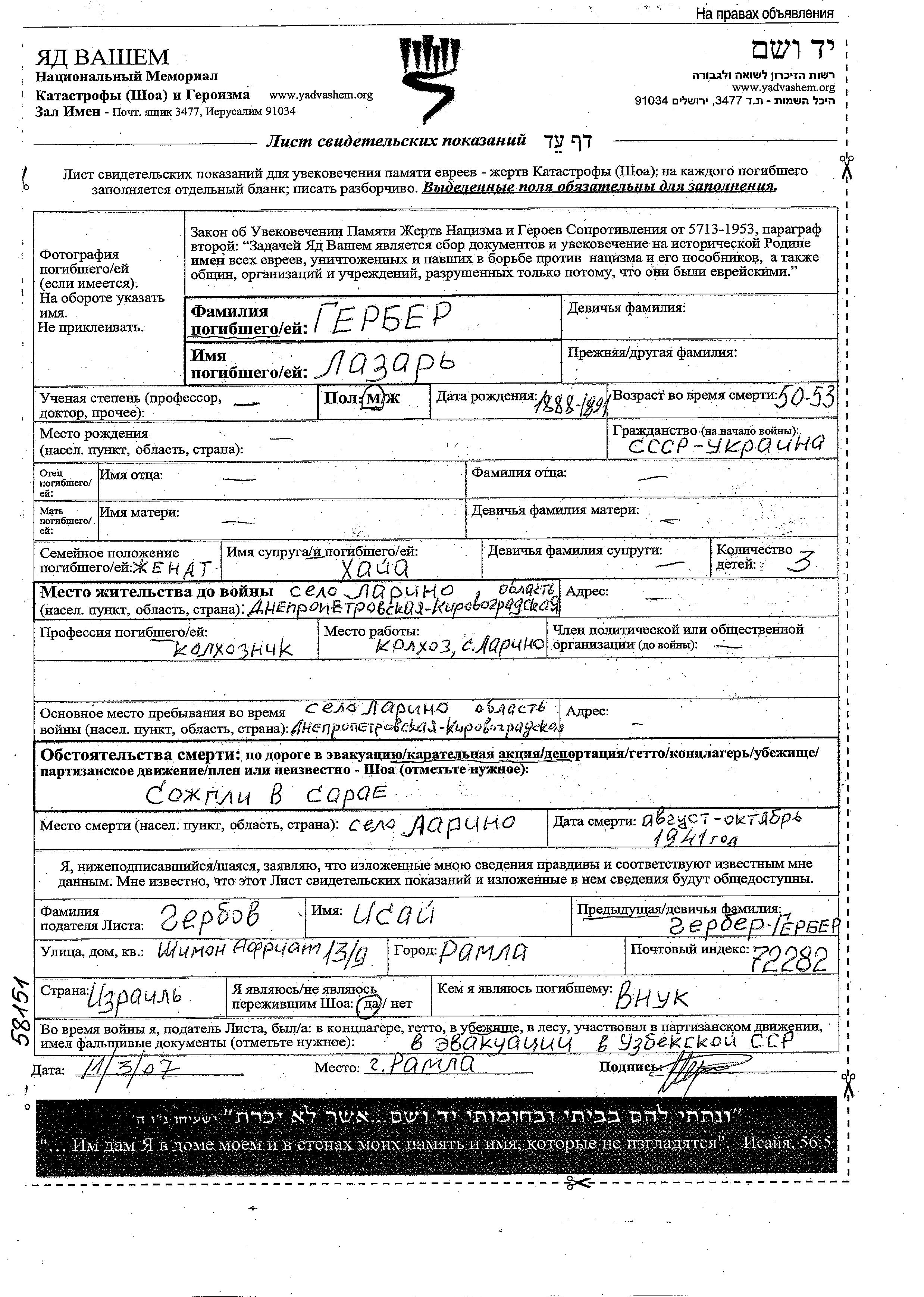 Lazar Gerber was born in Ukraine (USSR). He was a kolkhoznik / kolkhoznitza and married to Khaya. Prior to WWII he lived in Larino, Ukraine (USSR). During the war he was in Larino, Ukraine (USSR). Lazar was murdered in the Shoah. Place of death: Larino, Ukraine (USSR), 09/1941.
