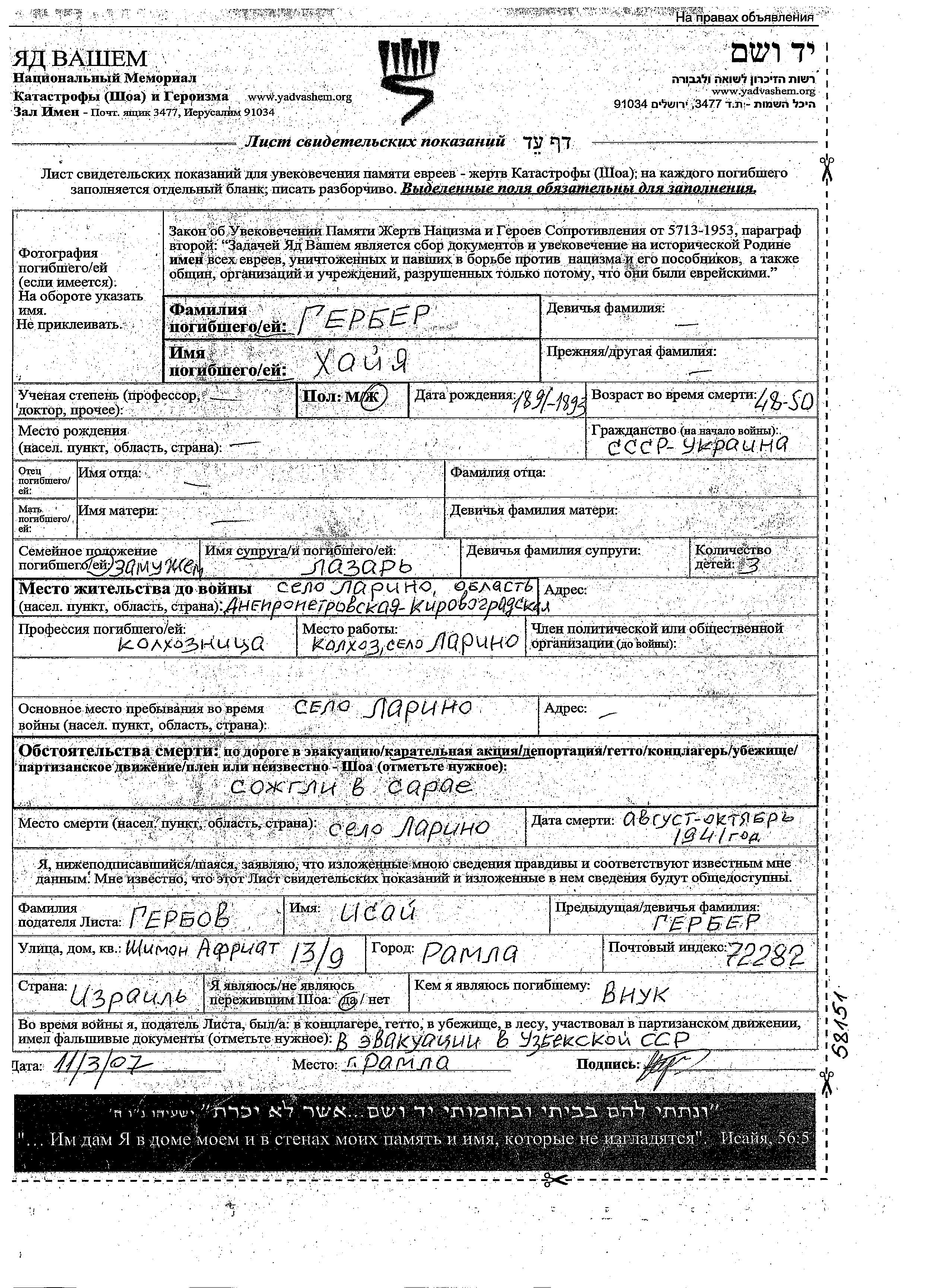 Khaya Gerber was born in Ukraine (USSR), 1891. She was a kolkhoznik / kolkhoznitza and married to Lazar. Prior to WWII she lived in Larino, Ukraine (USSR). During the war she was in Larino, Ukraine (USSR). Khaya was murdered in the Shoah. Place of death: Larino, Ukraine (USSR), 09/1941.