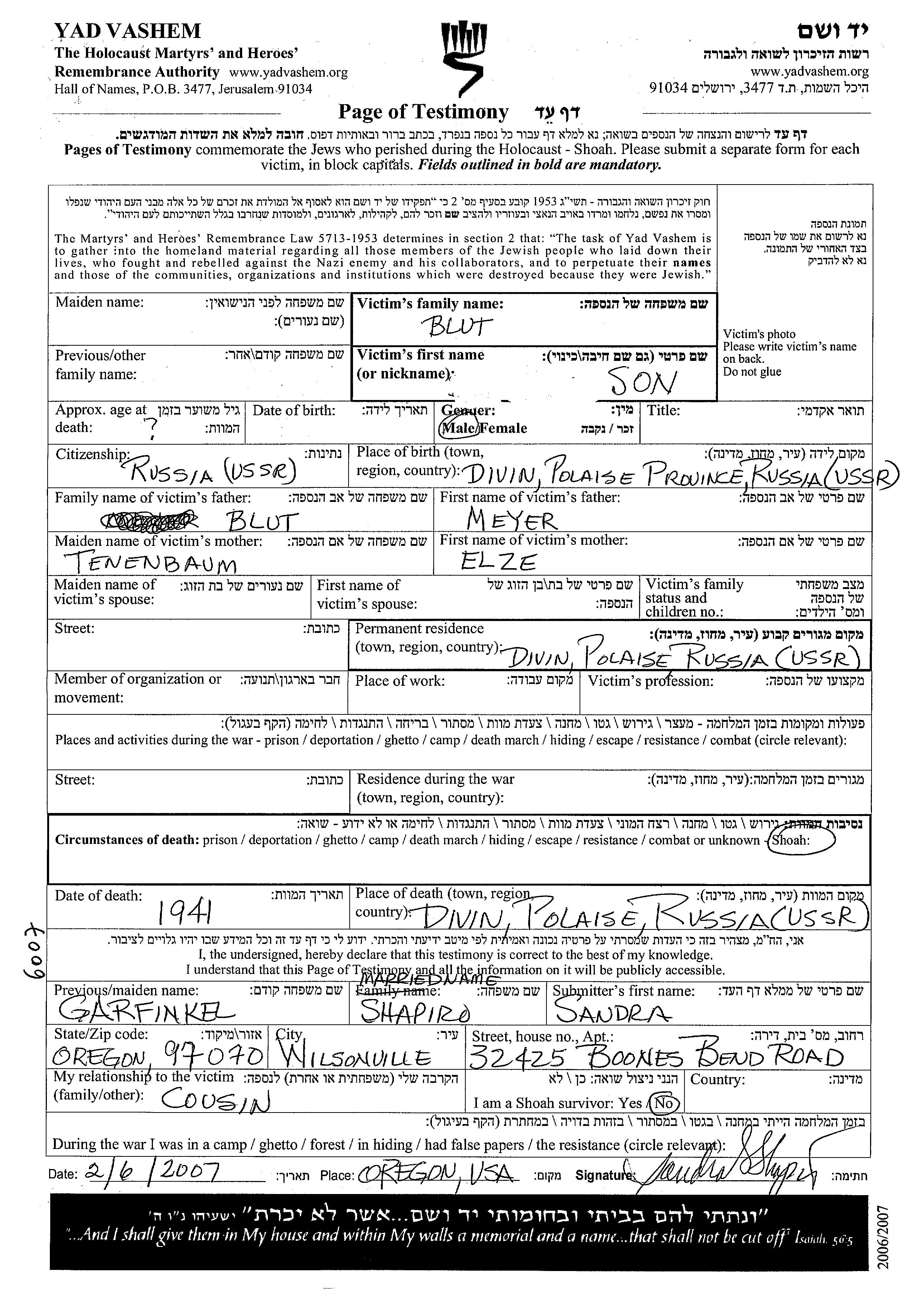First name unknown Blut was born in Divin, Poland to Meyer and Elze nee Tenenbaum. Prior to WWII he lived in Divin, Poland.