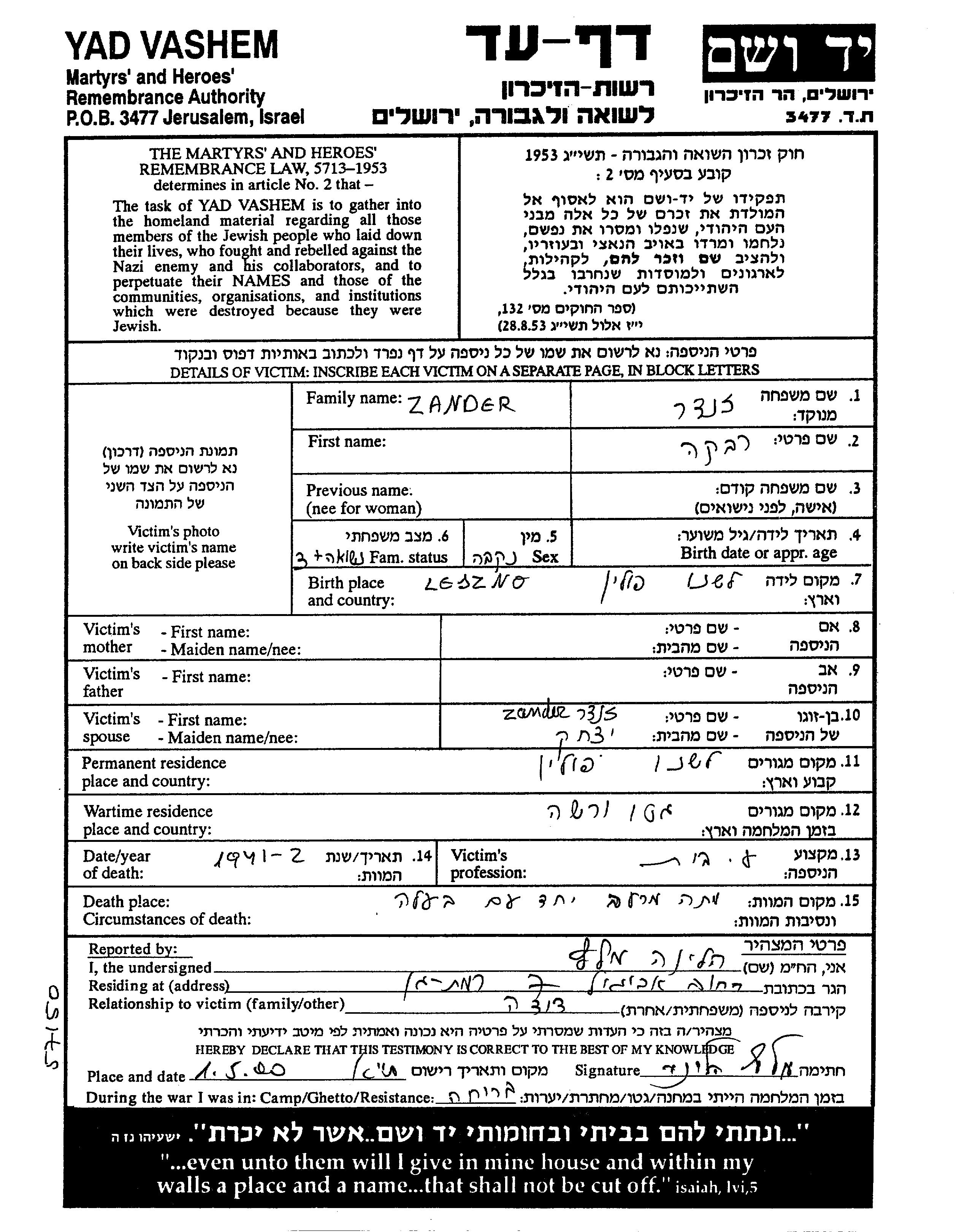 Rivka Zander was born in Leszno, Poland. She was a housewife and married to Yitzkhak. Prior to WWII she lived in Leszno, Poland. During the war she was in Warszawa, Poland. Rivka was murdered in the Shoah. Place of death: unknown, 1941.