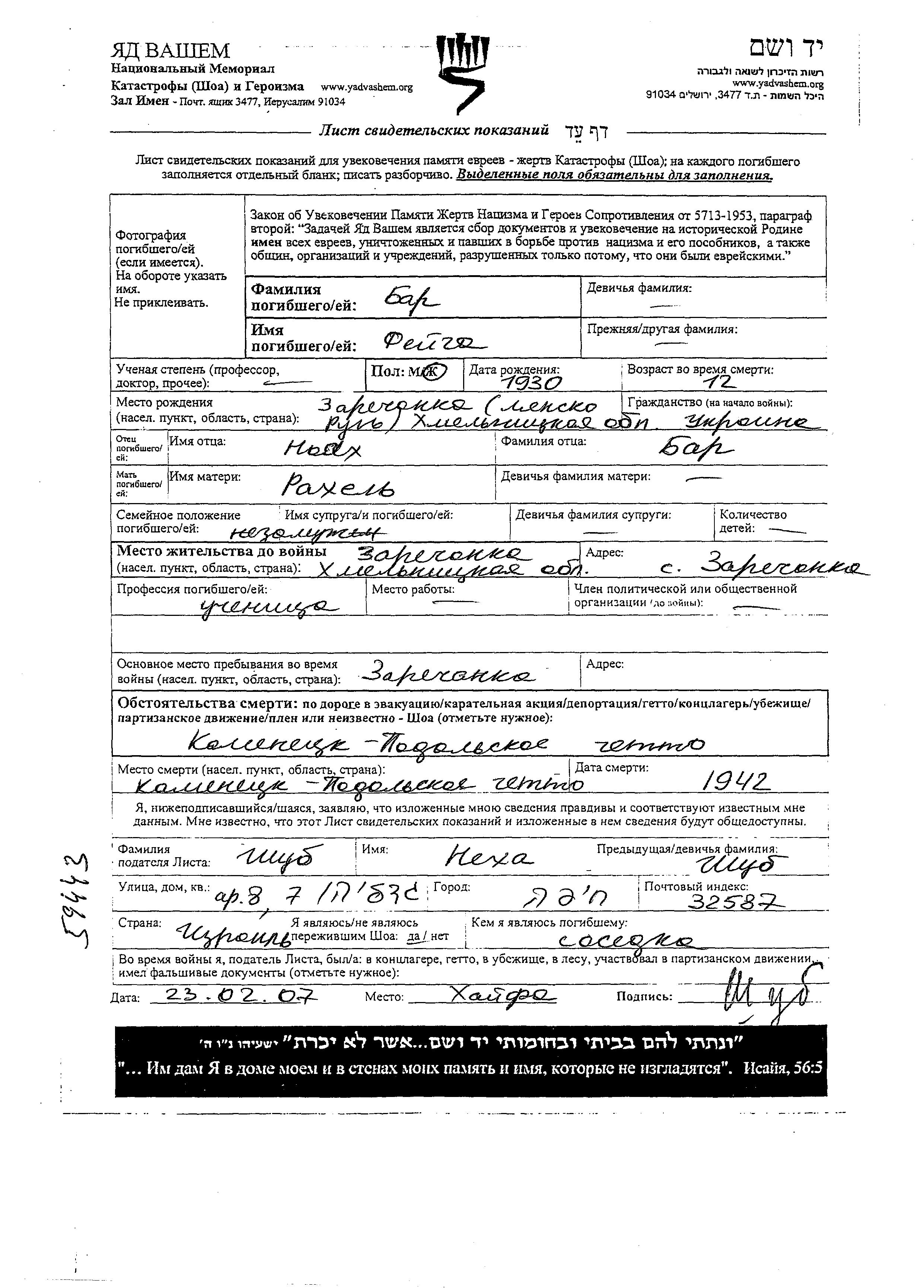 Bar Feiga 1930 Zarechanka, Ukraine (USSR) Page of Testimony