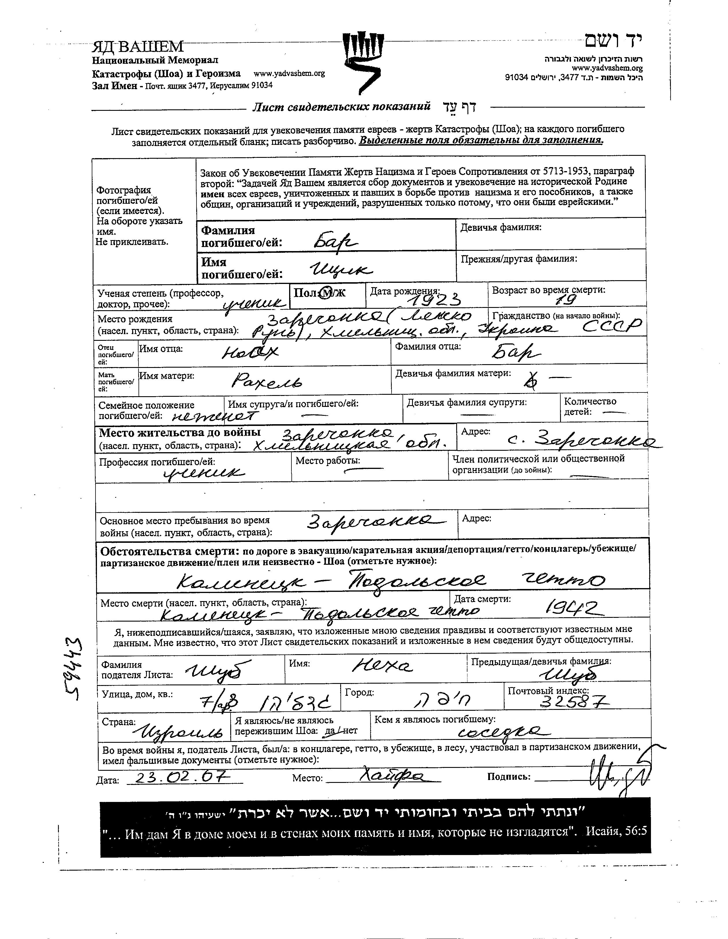 Bar Itzik 1923 Zarechanka, Ukraine (USSR) Page of Testimony