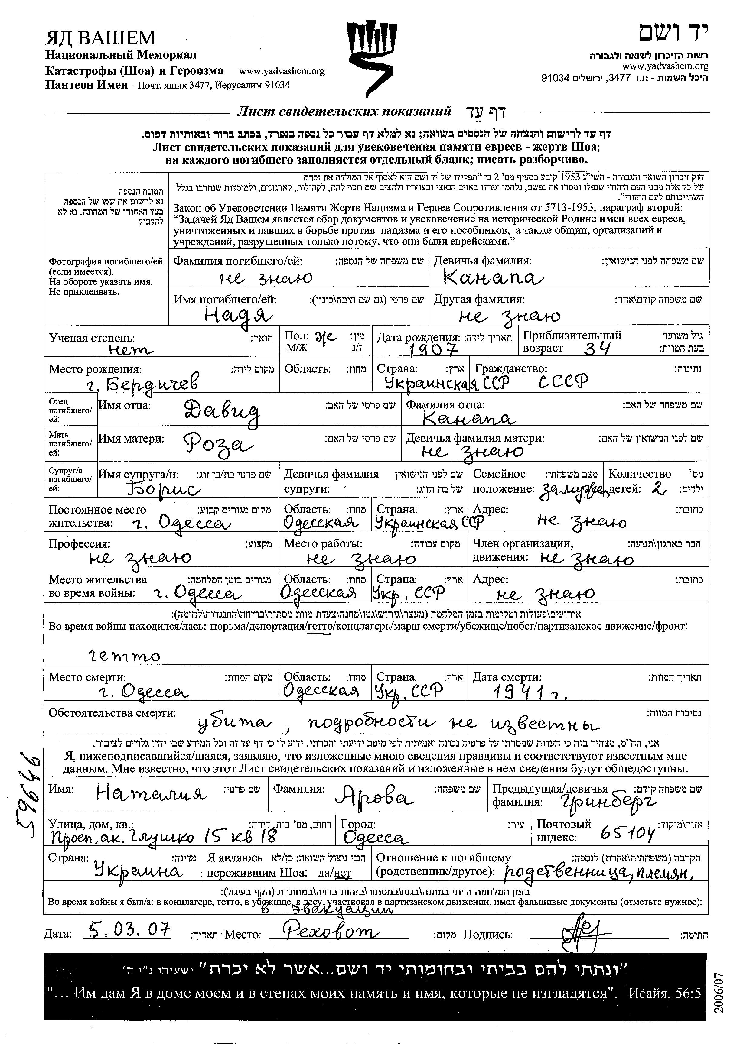Nadya Surname unknown nee Kanapa was born in Berdichev, Ukraine (USSR), 1907 to David and Roza. She was married to Boris. Prior to WWII she lived in Odessa, Ukraine (USSR). During the war she was in Odessa, Ukraine (USSR). Nadya was murdered in the Shoah. Place of death: Odessa, Ukraine (USSR), 1941.