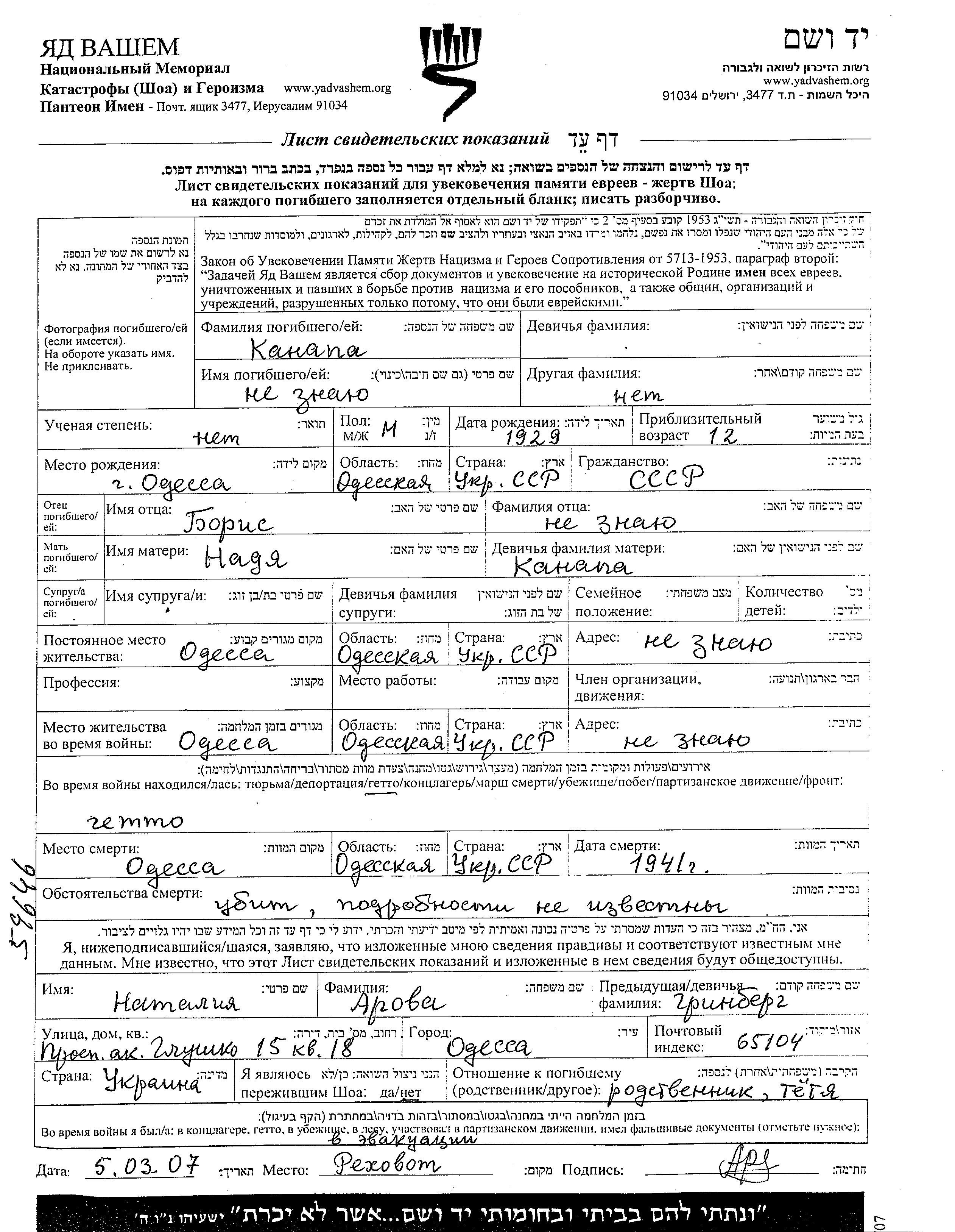 First name unknown Kanapa was born in Odessa, Ukraine (USSR), 1929 to Boris and Nadya. He was child. Prior to WWII he lived in Odessa, Ukraine (USSR). During the war he was in Odessa, Ukraine (USSR). He was murdered in the Shoah. Place of death: Odessa, Ukraine (USSR), 1941.