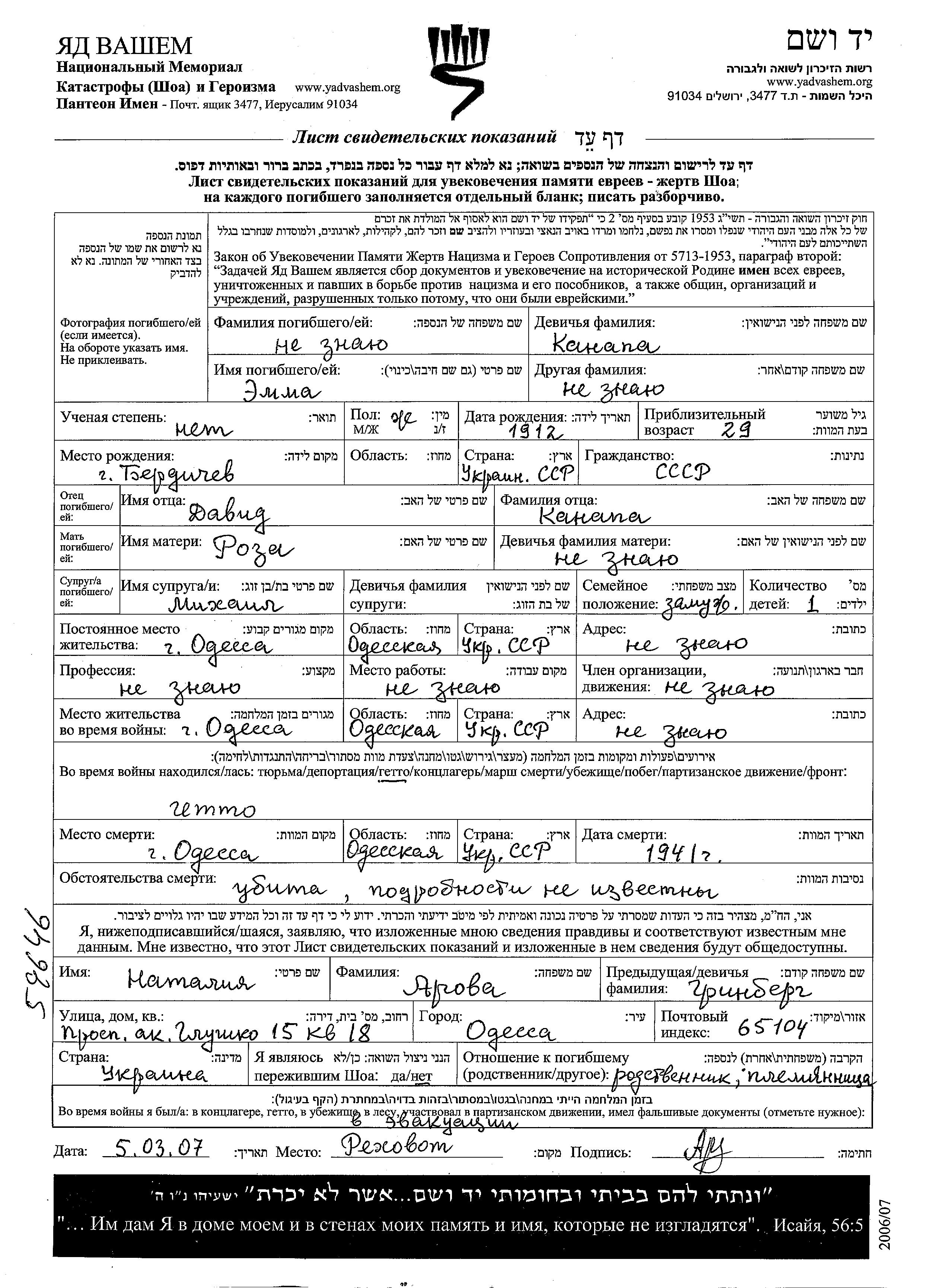 Emma Surname unknown nee Kanapa was born in Berdichev, Ukraine (USSR), 1912 to David and Roza. She was married to Mikhail. Prior to WWII she lived in Odessa, Ukraine (USSR). During the war she was in Odessa, Ukraine (USSR). Emma was murdered in the Shoah. Place of death: Odessa, Ukraine (USSR), 1941.