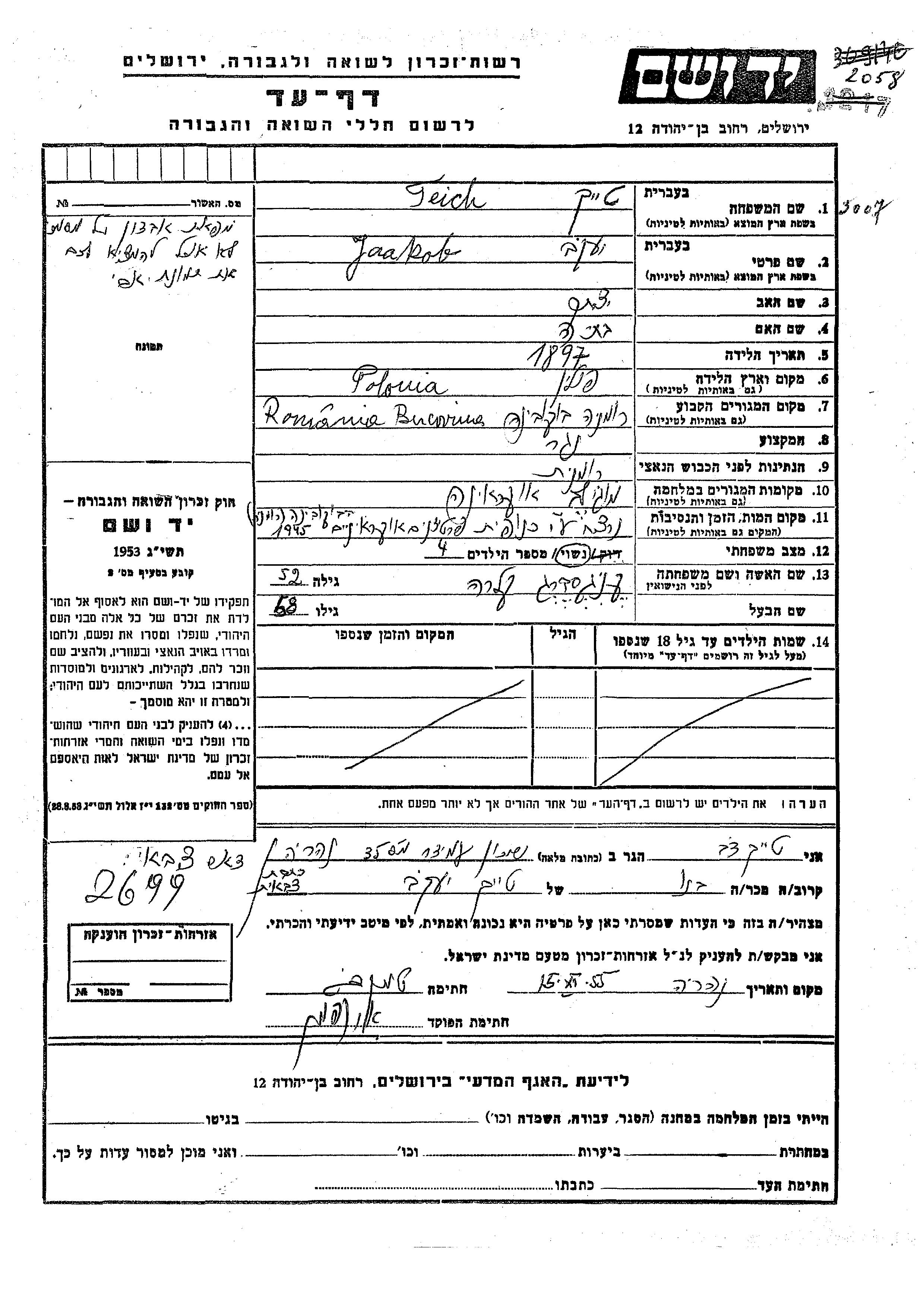 Teich Jaakob 1897 Romania Page of Testimony