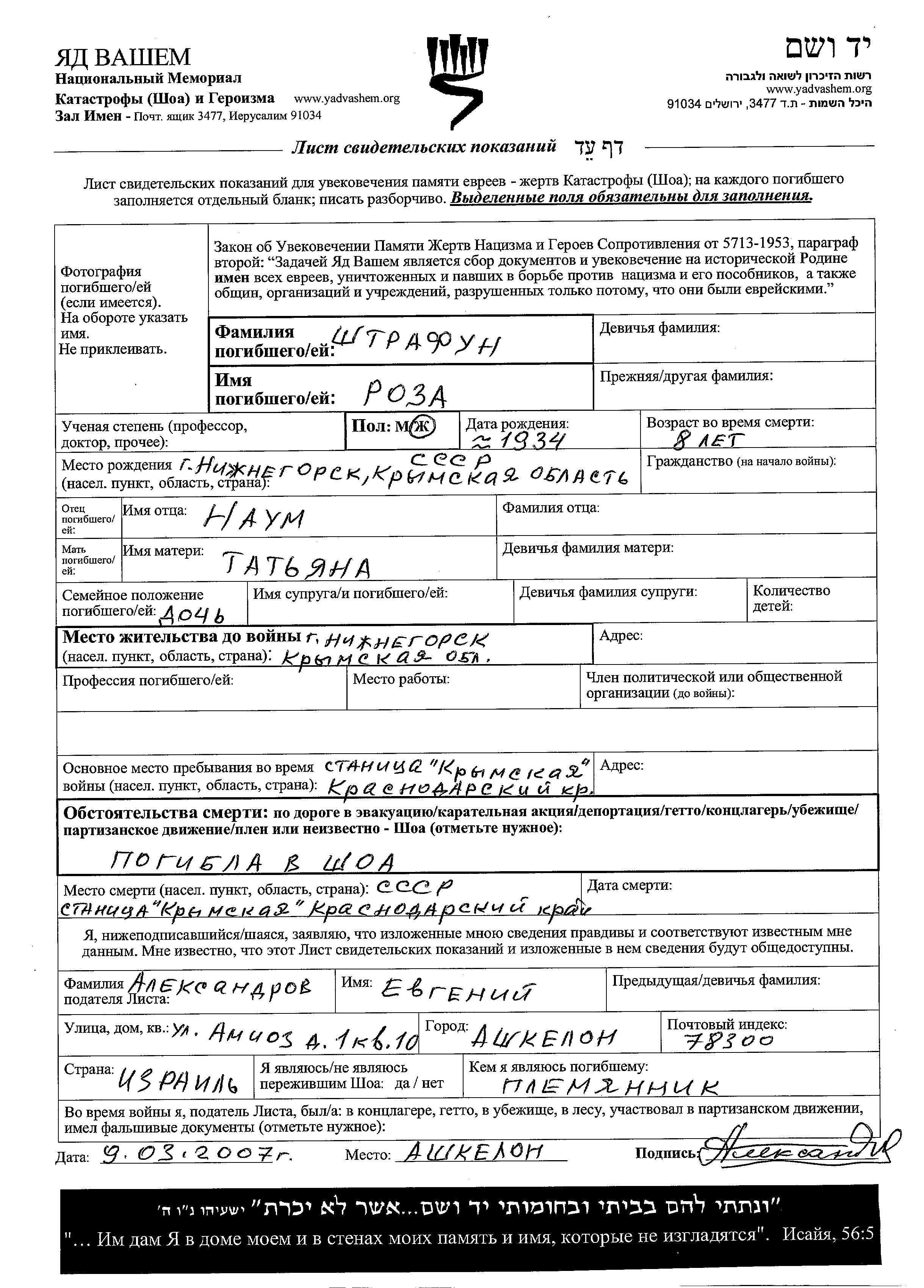 Roza Shtrafun was born in Nizhnegorskiy, Russia (USSR), 1934 to Naum and Tatiana. She was child. Prior to WWII she lived in Nizhnegorskiy, Russia (USSR). During the war she was in Krymskaya, Russia (USSR). Roza was murdered in the Shoah. Place of death: Krymskaya, Russia (USSR).