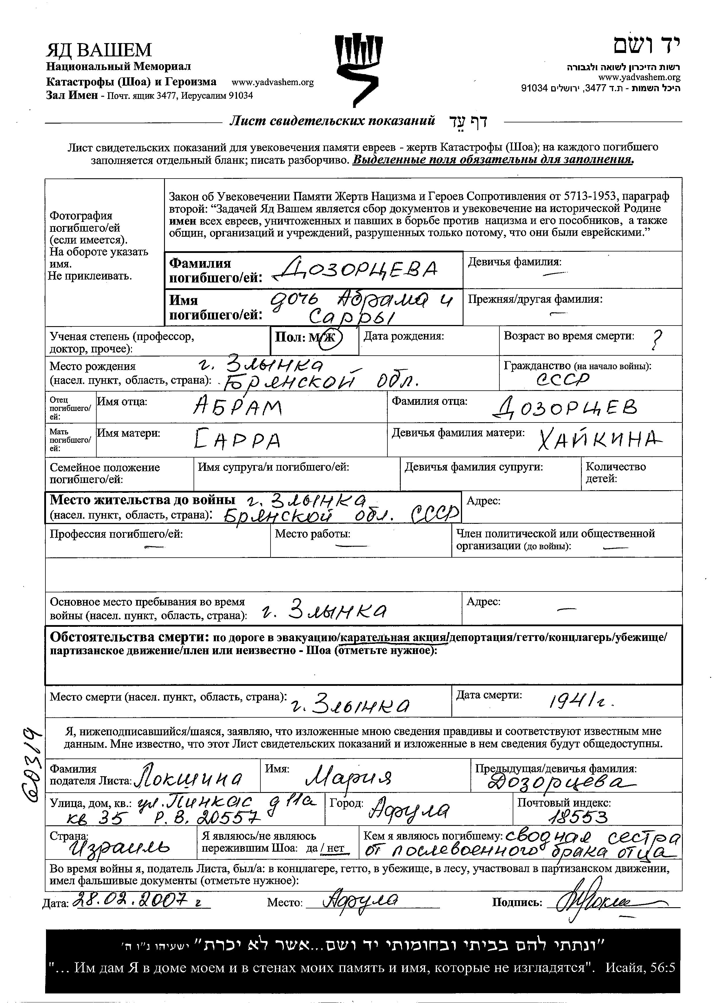 Dozortzeva First name unknown Zlynka, Russia (USSR) Page of Testimony
