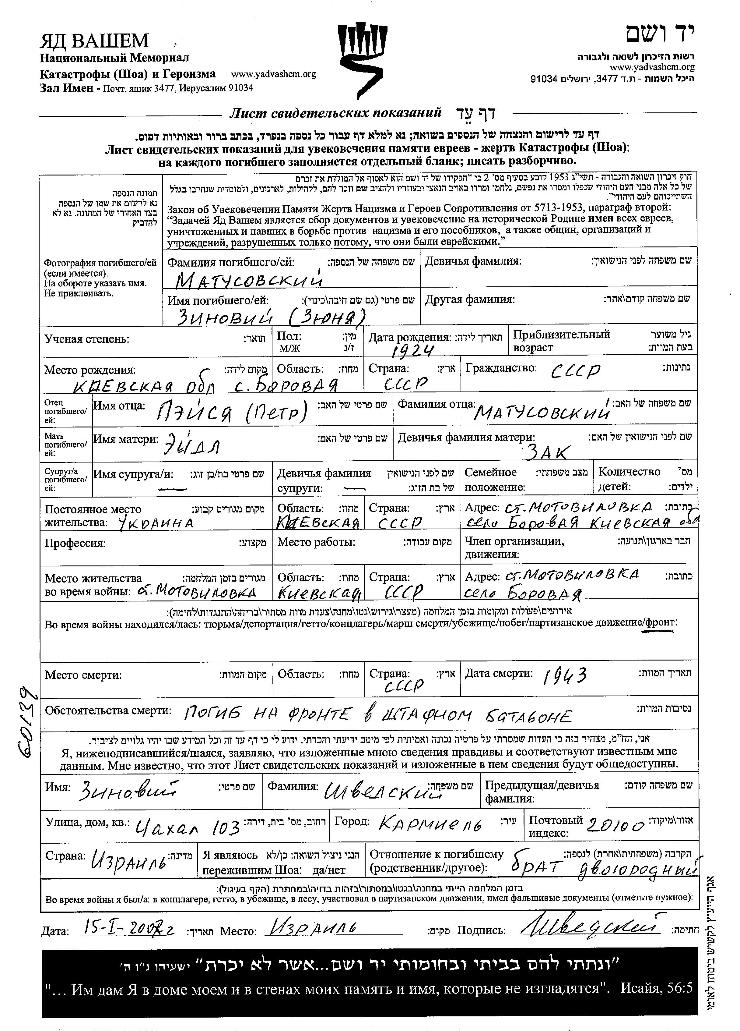 Matusovski Zyunya 1924 Borovaya, Ukraine (USSR) Page of Testimony