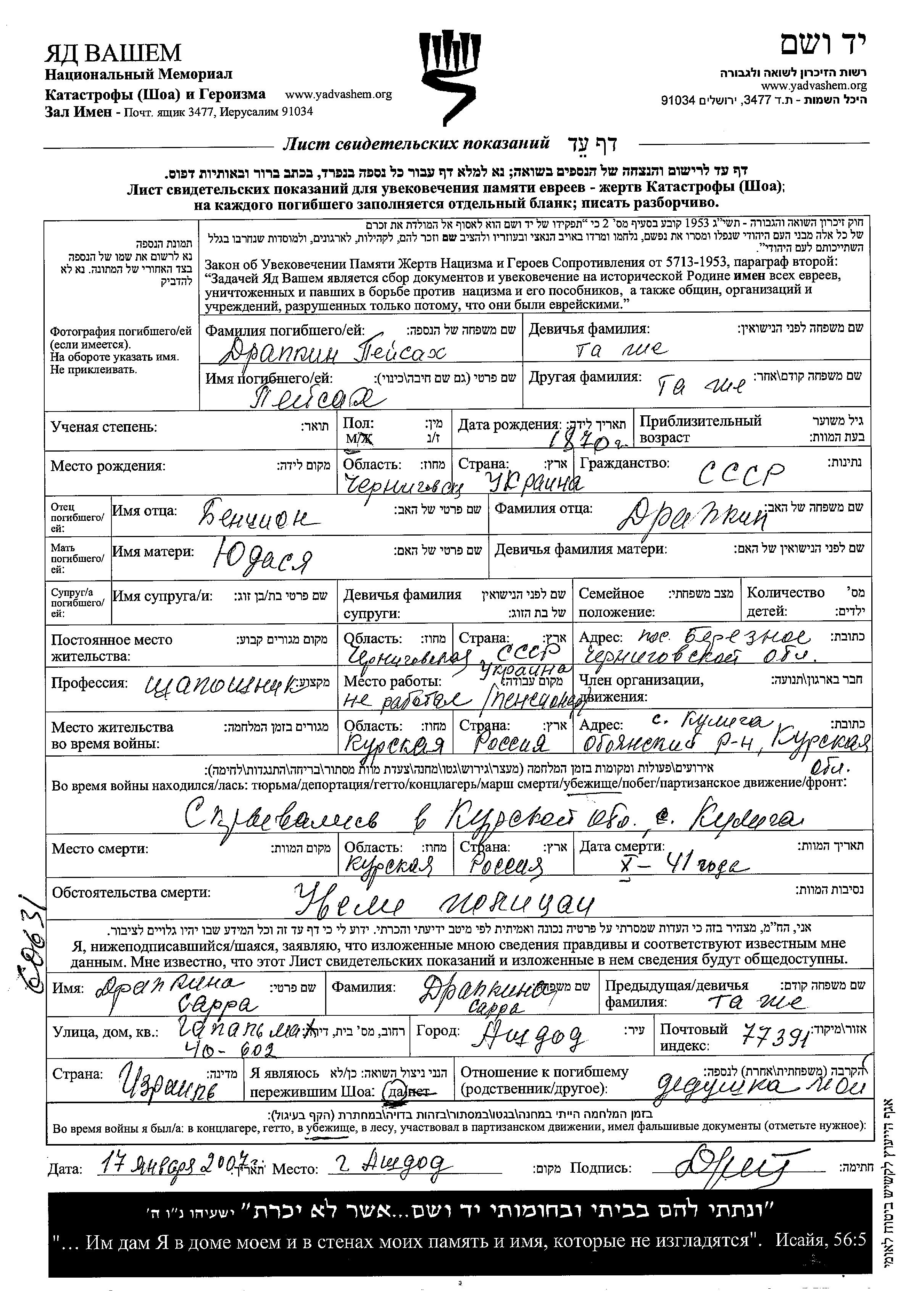 Yad Vashem - Pages of Testimony Names Memorial Collection