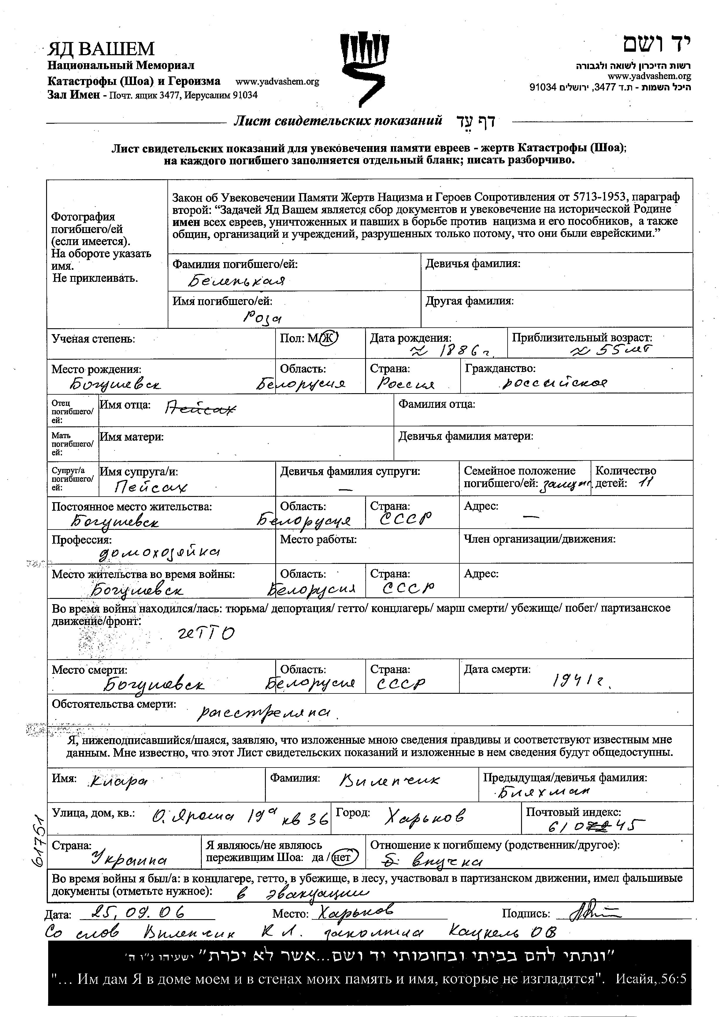 Roza Belenkaya was born in Bogushevsk, Belorussia (USSR), 1886. She was a housewife and married to Peisakh. Prior to WWII she lived in Bogushevsk, Belorussia (USSR). During the war she was in Bogushevsk, Belorussia (USSR). Roza was murdered in the Shoah. Place of death: Bogushevsk, Belorussia (USSR), 1941.