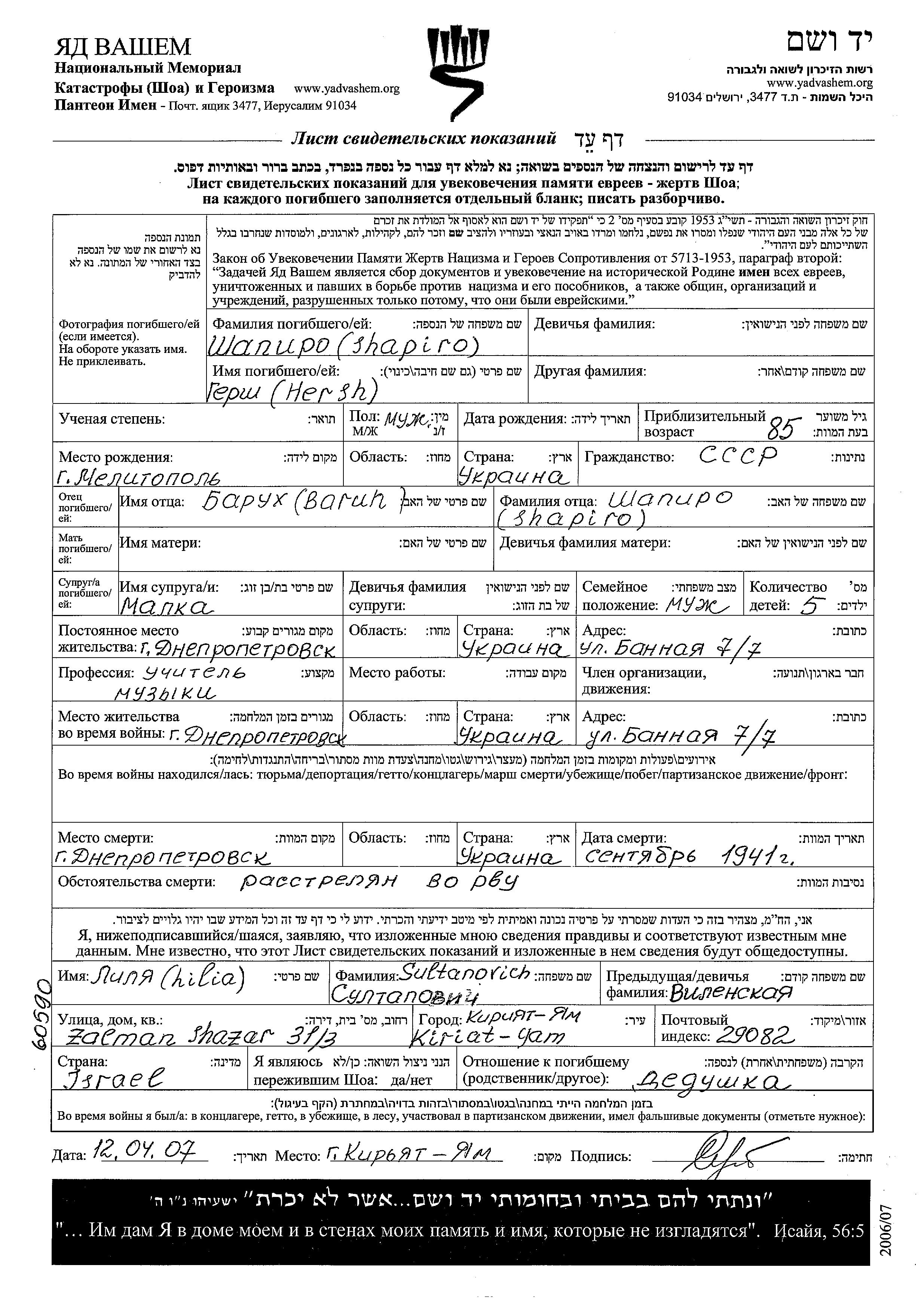 Shapiro Gersh Dnepropetrovsk, Ukraine (USSR) Page of Testimony
