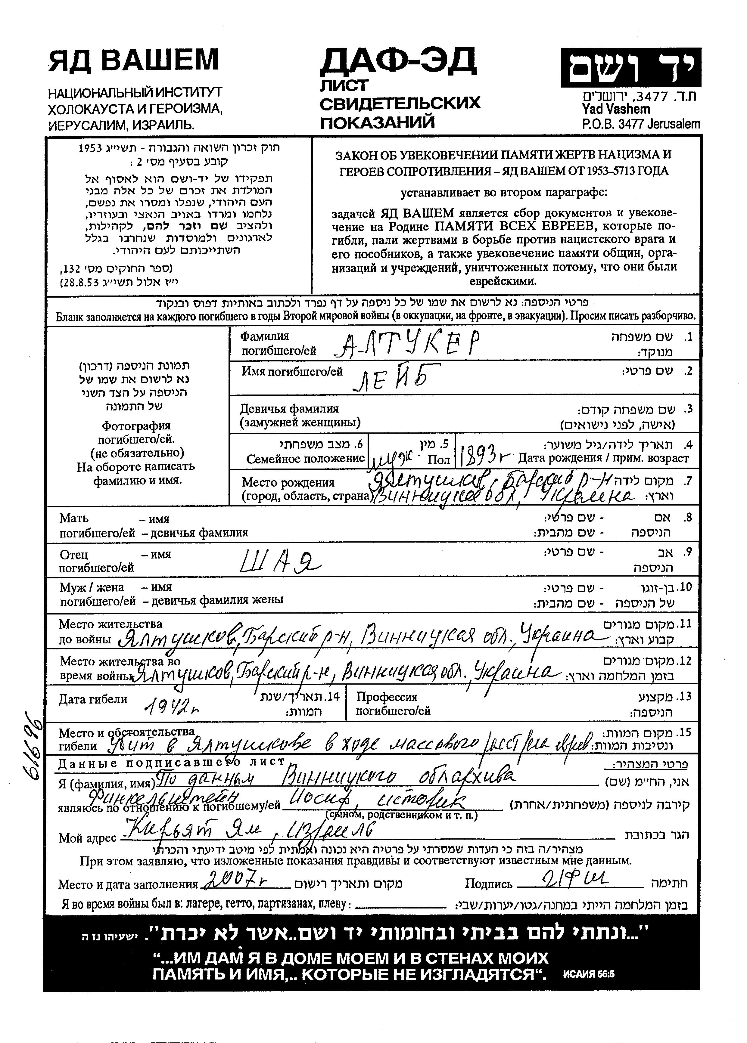 Altuker Leib 1893 Yaltushkov, Ukraine (USSR) Page of Testimony