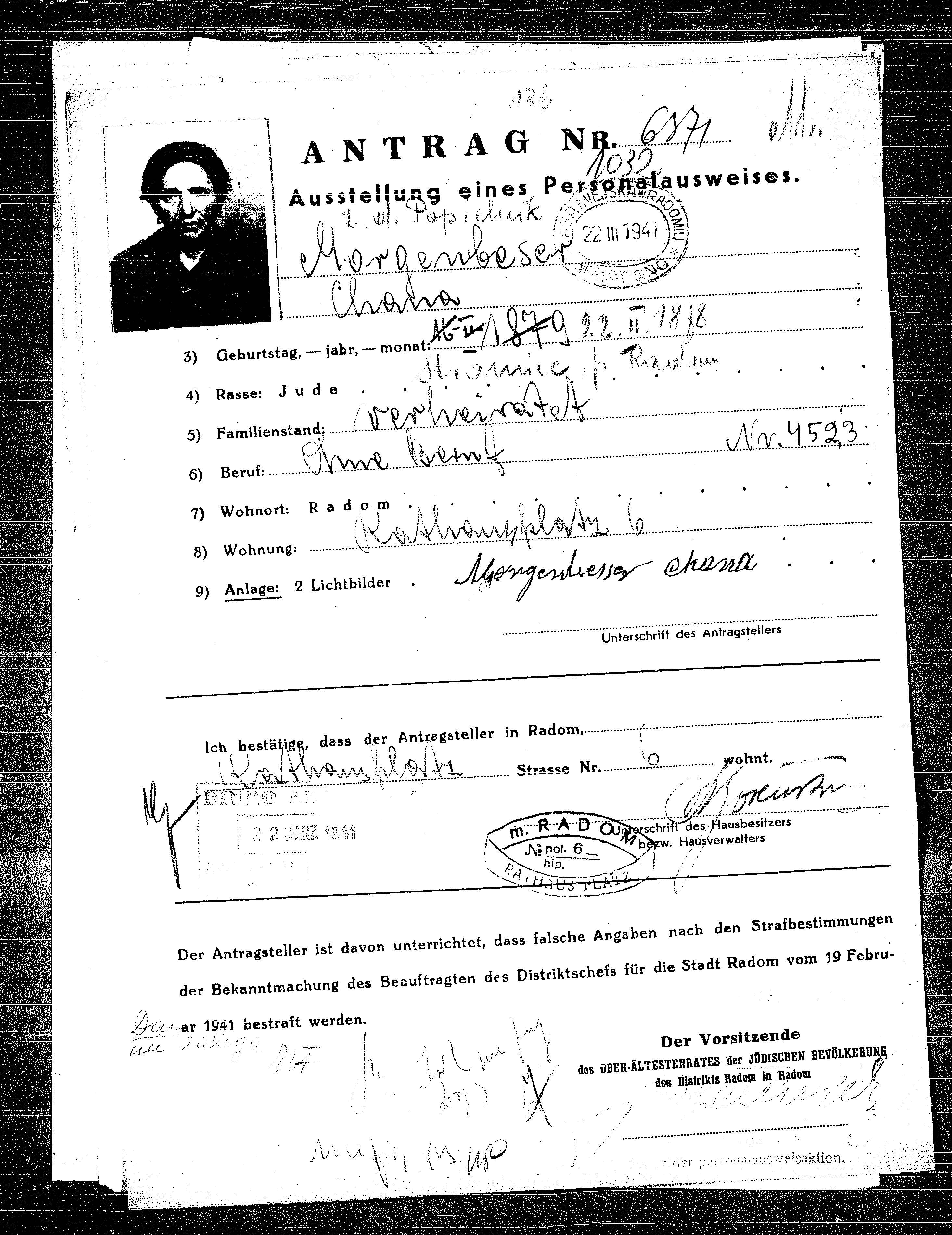 Chana Morgenbeser was born in Stromiec, Poland, 1878. She was a without profession and married. Prior to WWII she lived in Radom, Poland. During the war she was in Radom, Poland. Chana Probably murdered the Shoah.