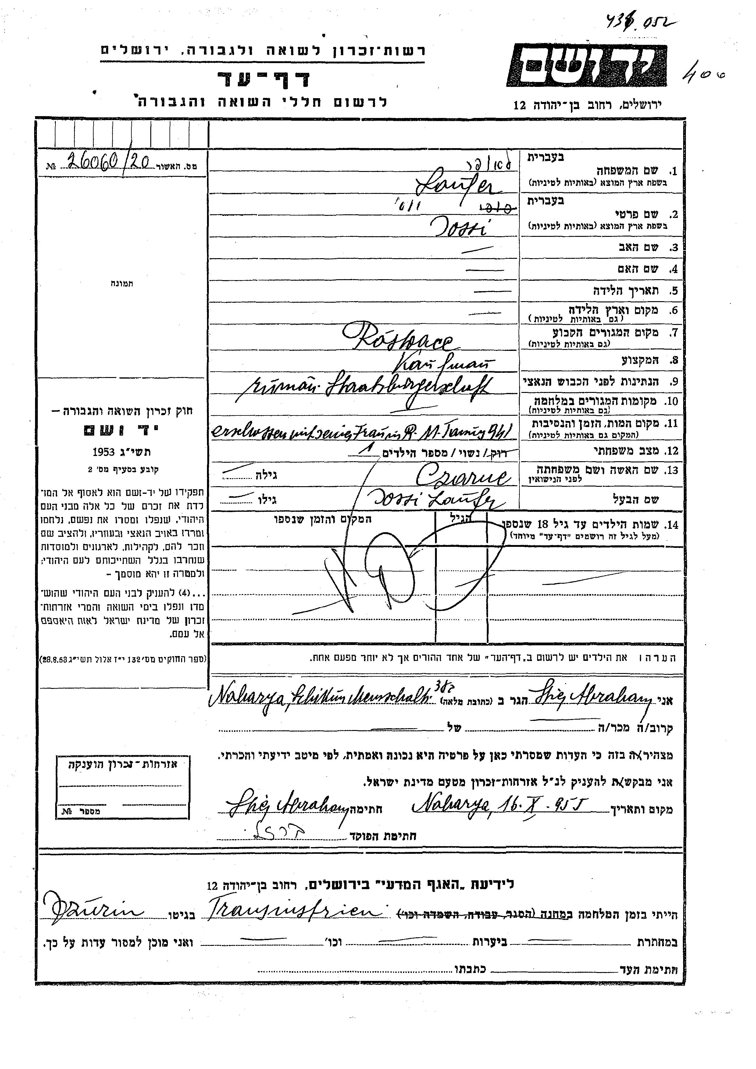 Josi Laufer. He was a merchant and married to Czarne. Prior to WWII he lived in Rastoace, Romania. During the war he was in Romania. Josi was murdered in the Shoah. Place of death: unknown, 1941.