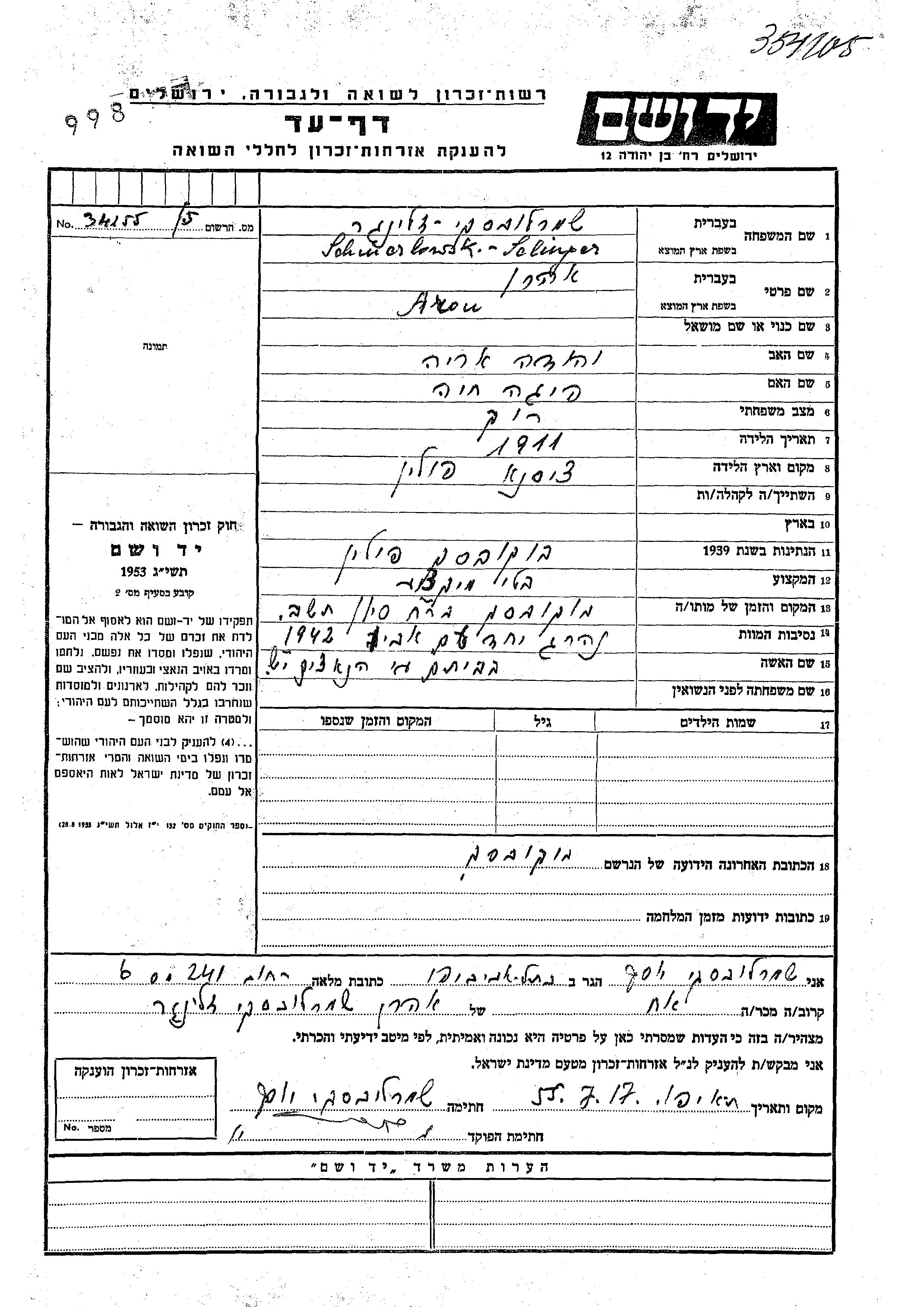 Aron Schmerlowski Selinger Tzalinger was born in Cisna, Poland, 1911 to Yehuda Arie and Feiga Khaia. He was single. During the war he was in Bukowsko, Poland. Aron was murdered in the Shoah. Place of death: Bukowsko, Poland.