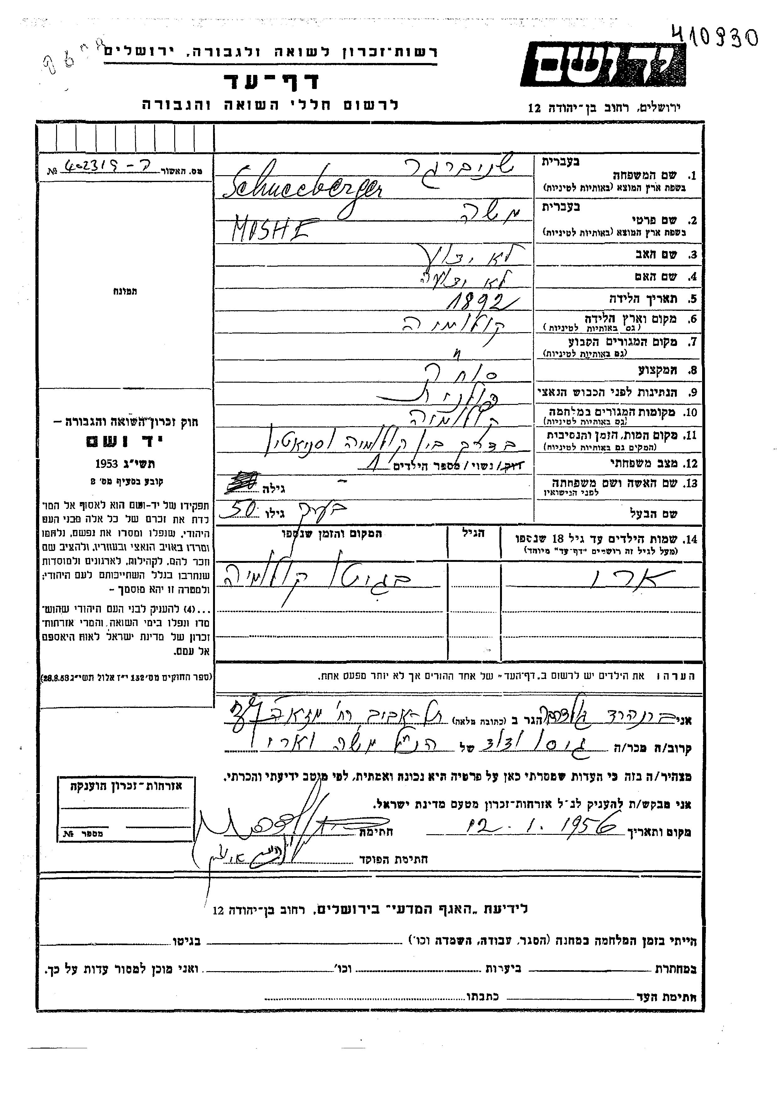 Moshe Schneeberger was born in Kolomiya, Poland, 1892. He was a merchant and married. Prior to WWII he lived in Kolomyia, Poland. During the war he was in Kolomiya, Poland.