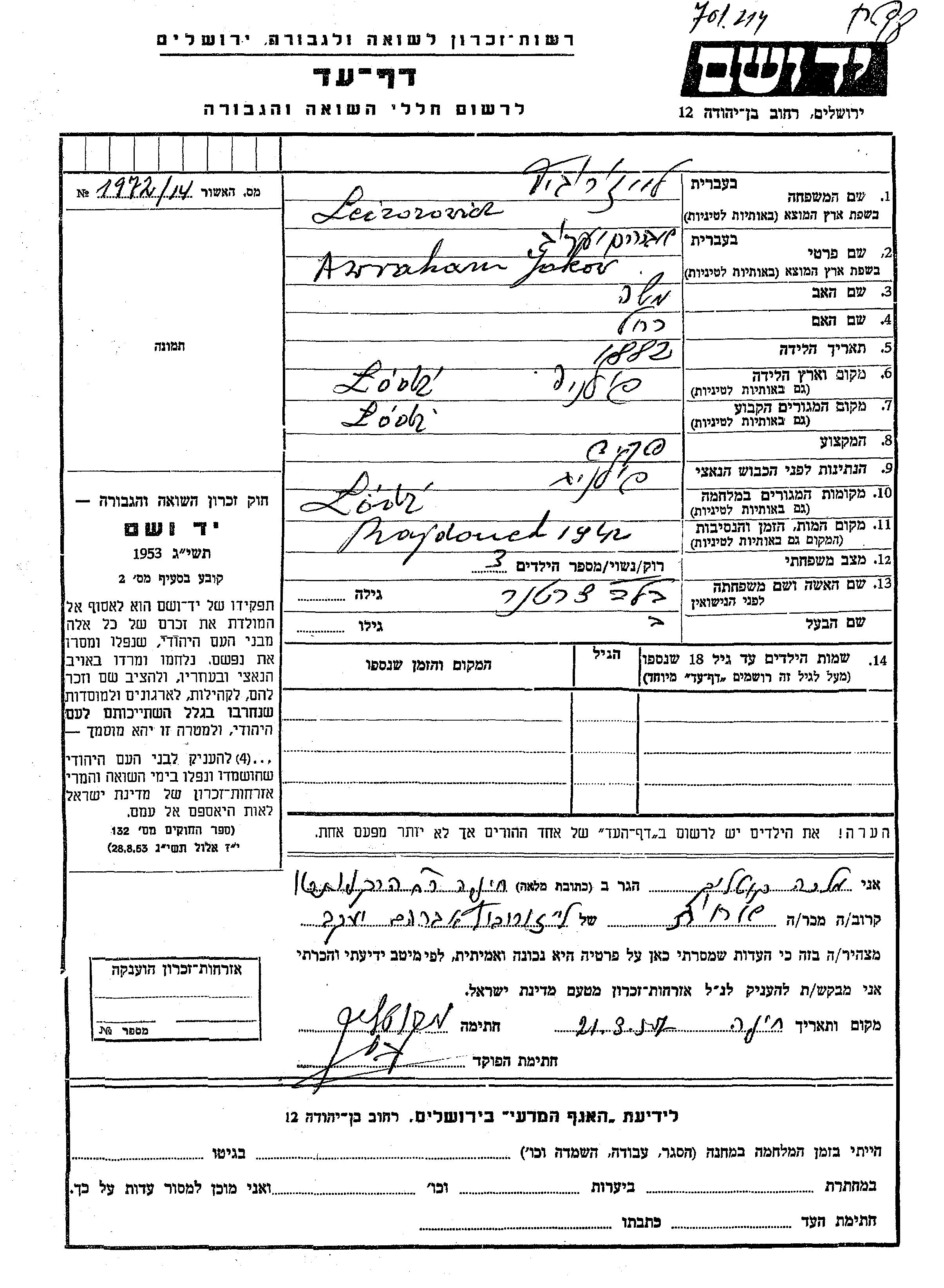 Awraham Yakov Leizorowicz was born in Lodz, Poland, 1882 to Moshe and Rakhel. He was a clerk and married to Bela nee Tzertner. During the war he was in Lodz, Poland.