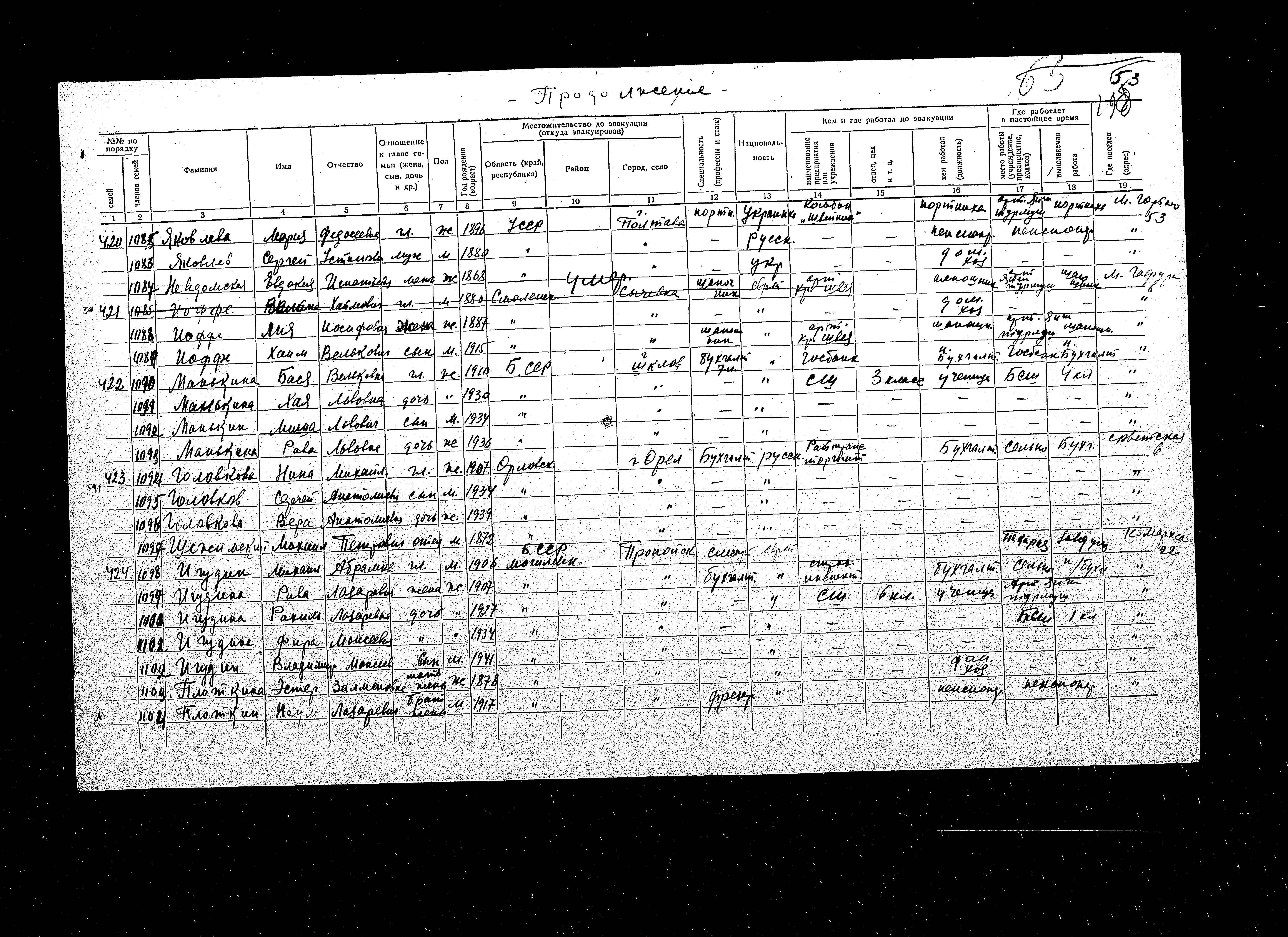 Liya Ioffe was born, 1887 to Iosif. She was married to Velka. Prior to WWII she lived in Sychevka, Russia (USSR). During the war she was in Burayevo, Russia (USSR). Liya was registered following the evacuation/ in the interior of the Soviet Union.