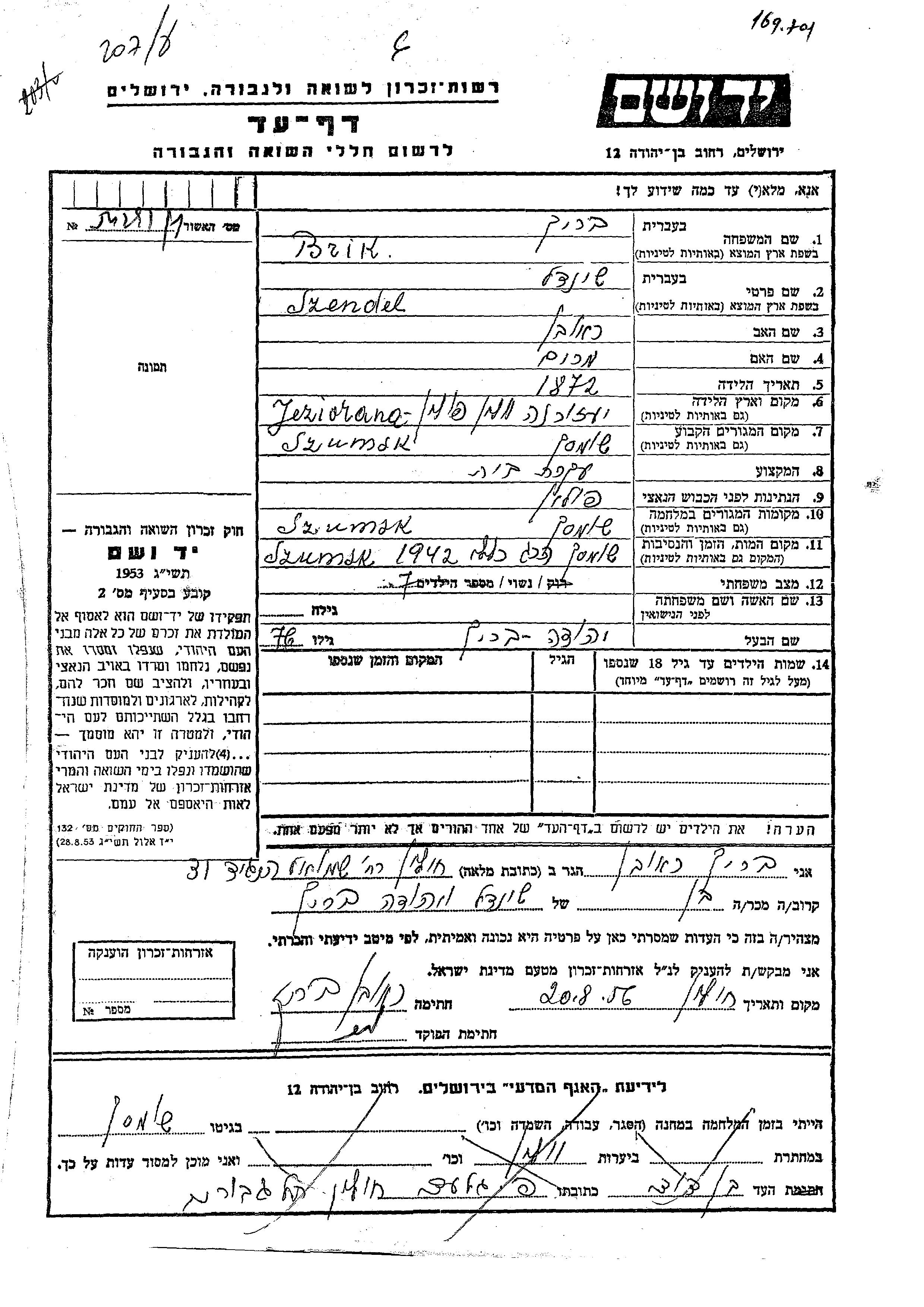 Szendel Brik was born in Jeziorany, Poland, 1872 to Reuven and Miriam. She was a housewife and married to Yehuda. Prior to WWII she lived in Szumsk, Poland. During the war she was in Szumsk, Poland. Szendel was murdered in the Shoah. Place of death: Szumsk, Poland, 1942.