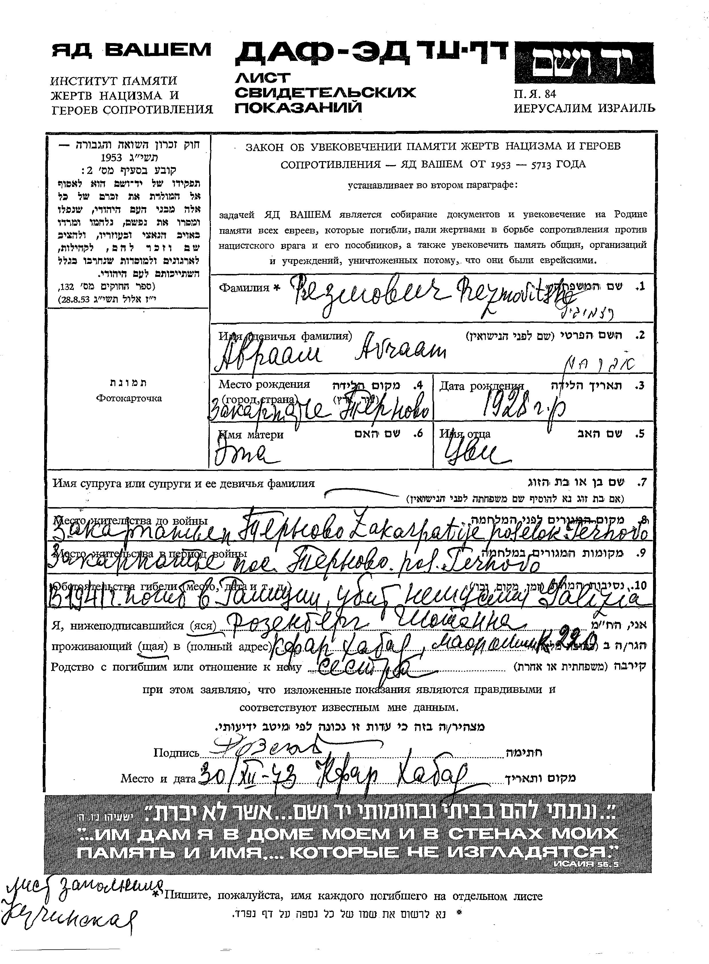 Rezmovitsh Avraam 1928 Ternovo, Czechoslovakia Page of Testimony