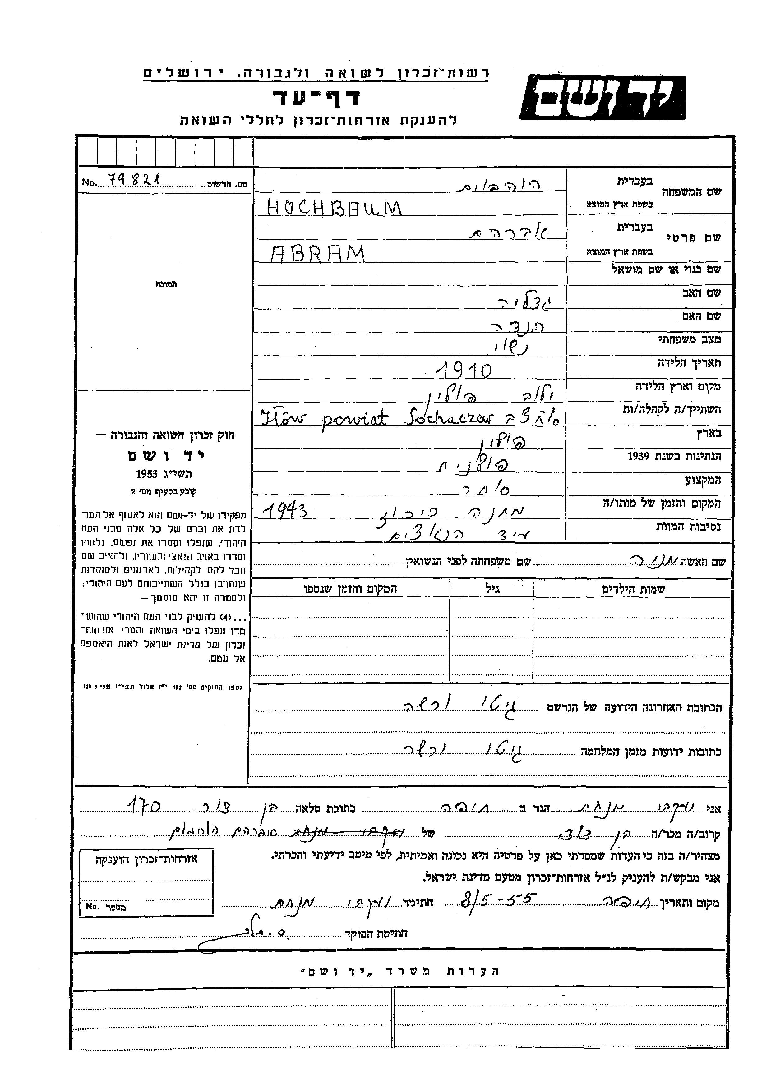 Hochbaum Abram 1910 Varsha, Poland Page of Testimony