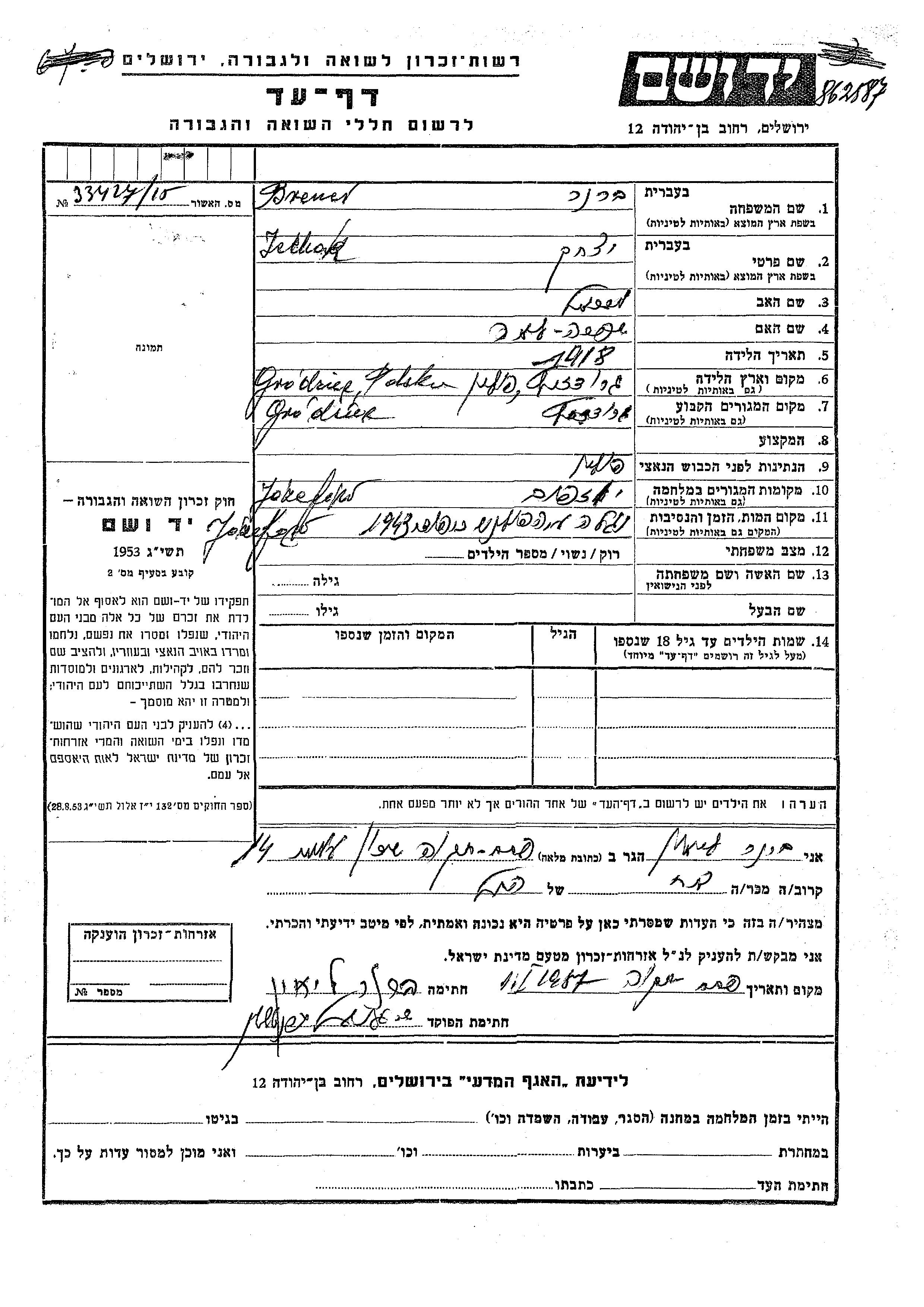 Icchak Brener was born in Grodziec, Poland, 1918 to Mikhael and Shifra Lea. Prior to WWII he lived in Grodziec, Poland. During the war he was in Jozefow, Poland. Icchak was murdered in the Shoah. Place of death: Jozefow, Poland, 1943.